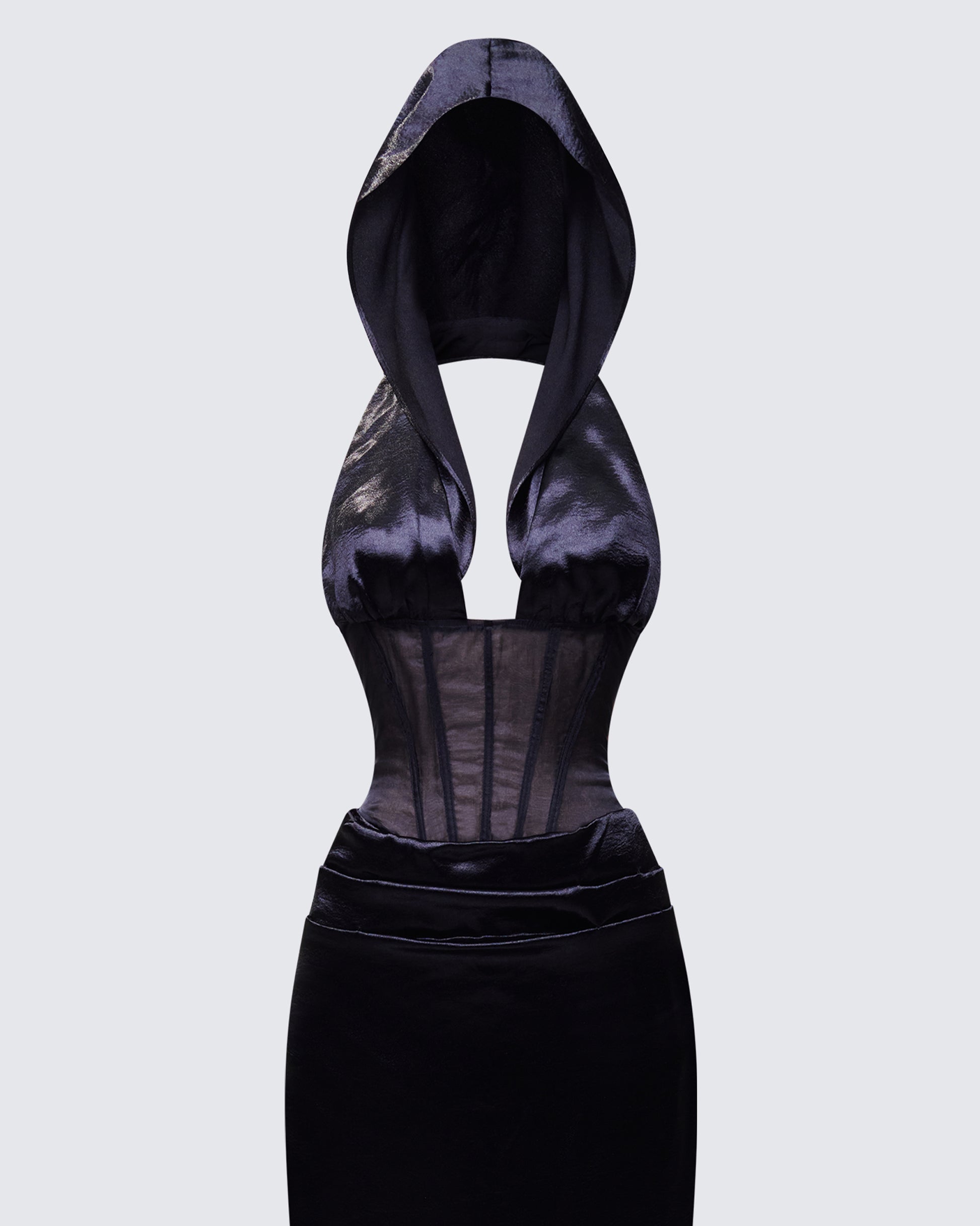Meet your midnight alter ego 🖤 This dress is complete with a sheer corset, a plunge neck with hood detail, and unapologetic gothic glamour for a look thats moody, magnetic, and made for nights you want the world at your feet 😏