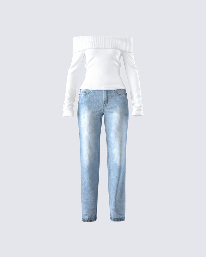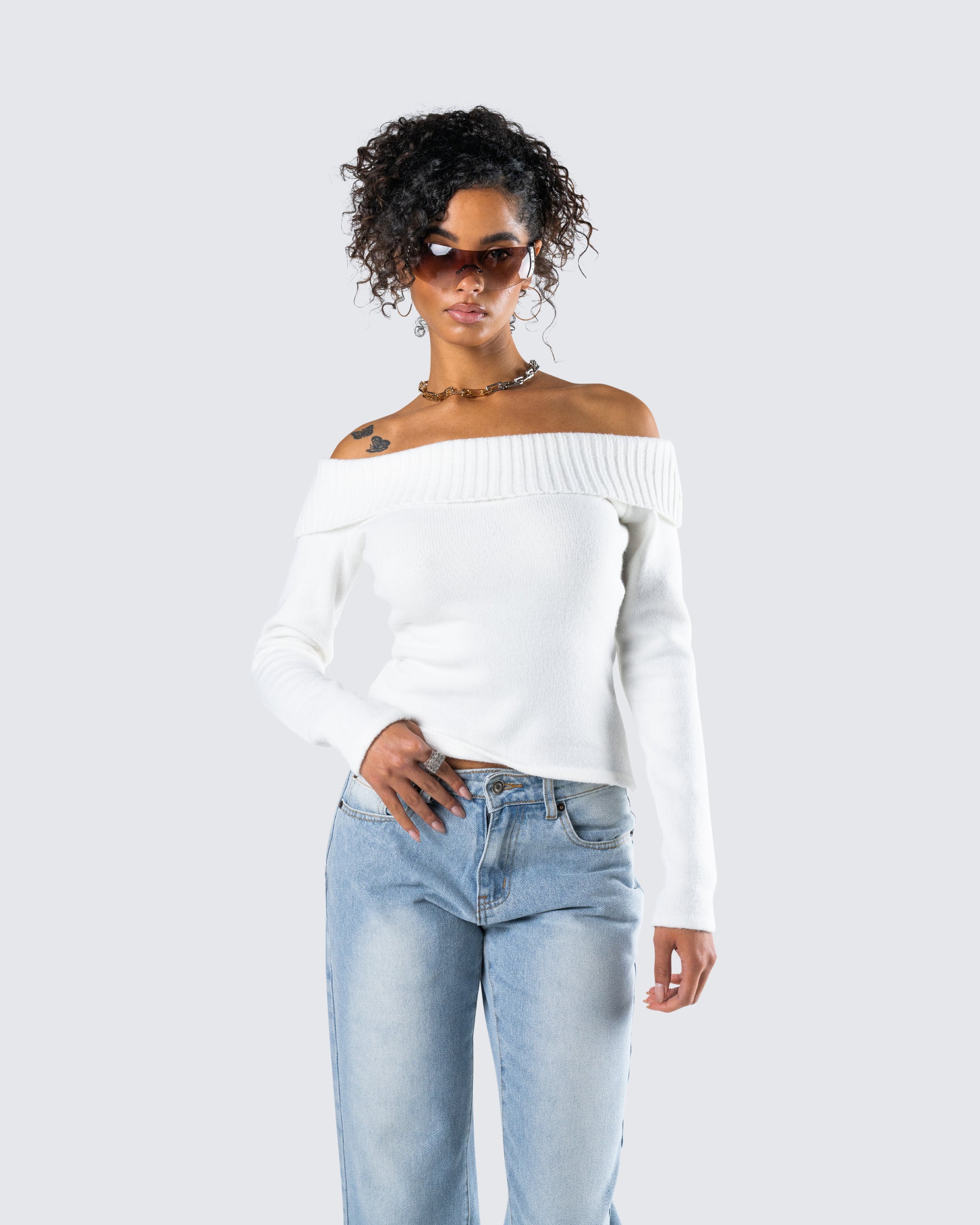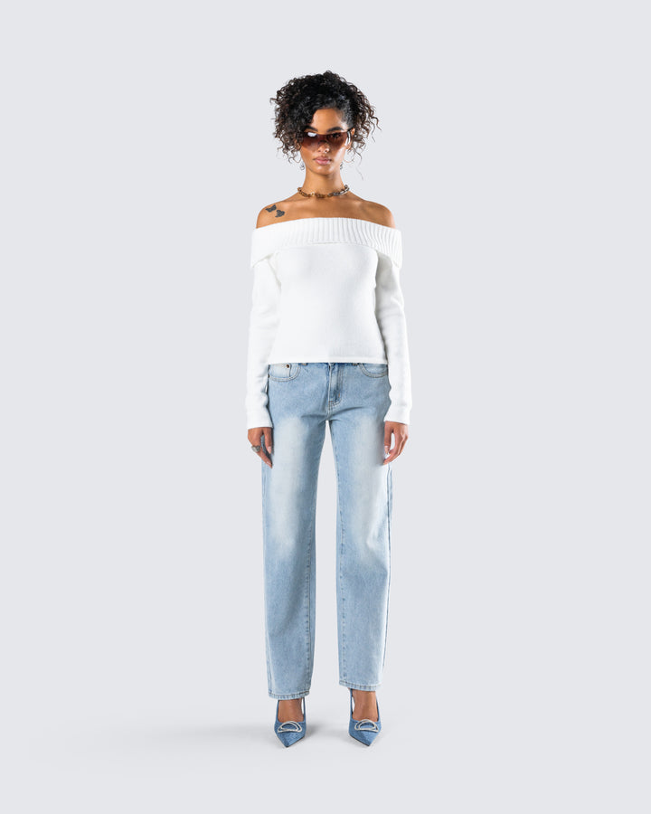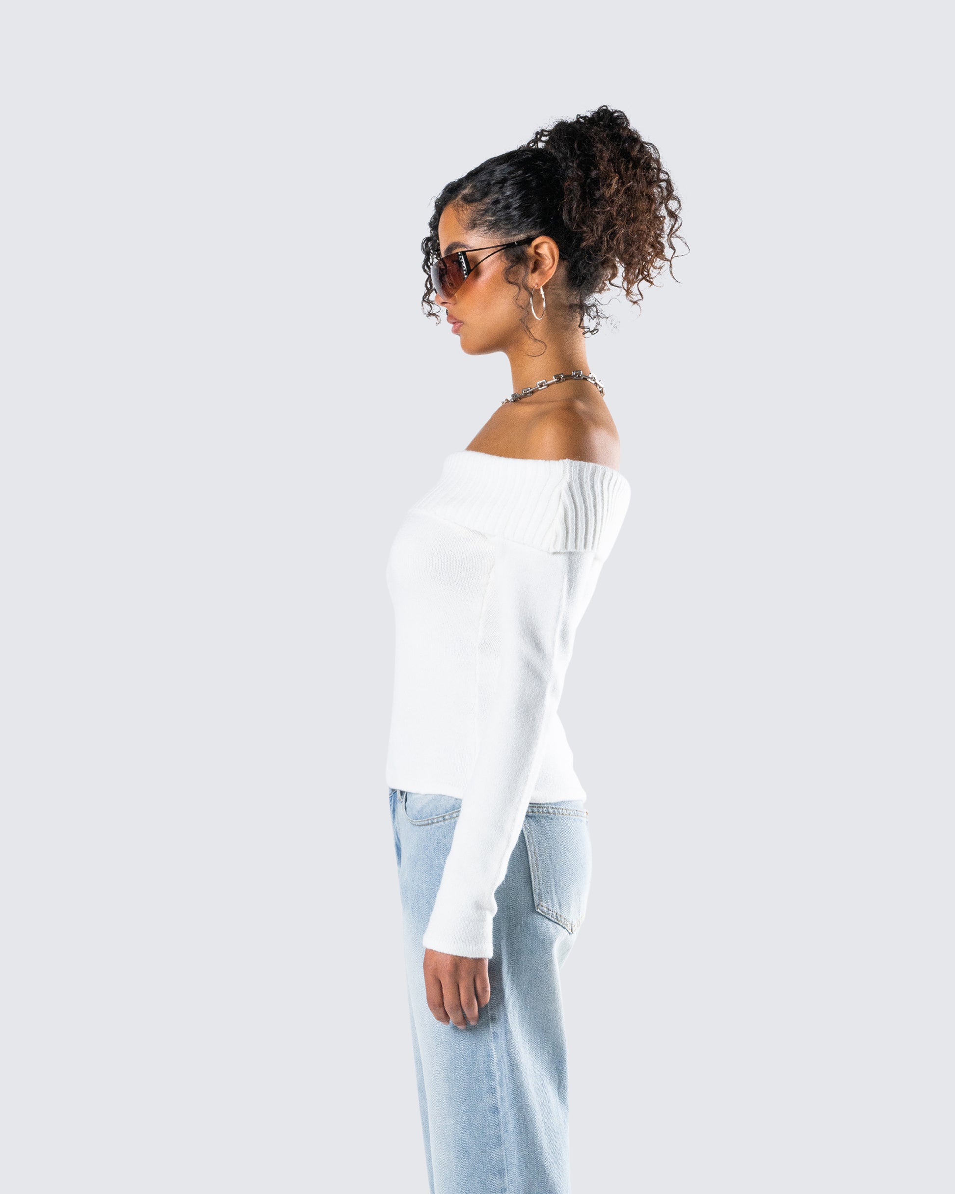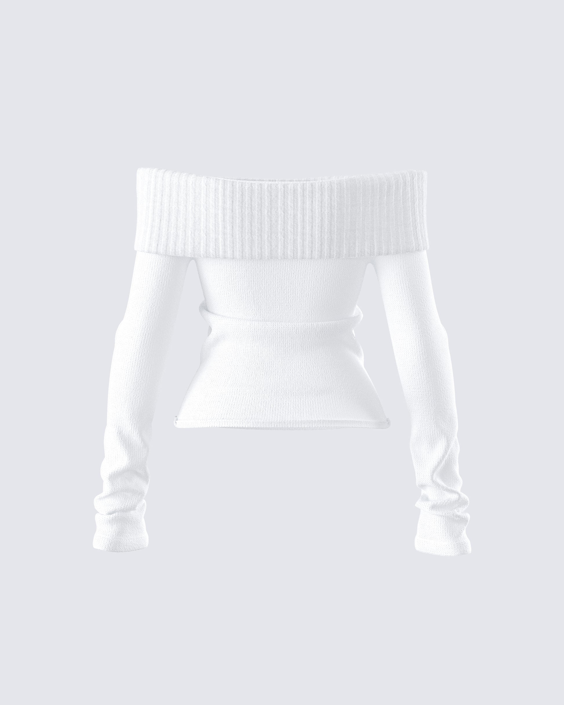 Nothing beats a chic and cozy look 🤍 Constructed from medium weight yarn fabric, featuring an off-shoulder design, a foldover top edge, and long sleeves - this white sweater top is a dream come true ☁️