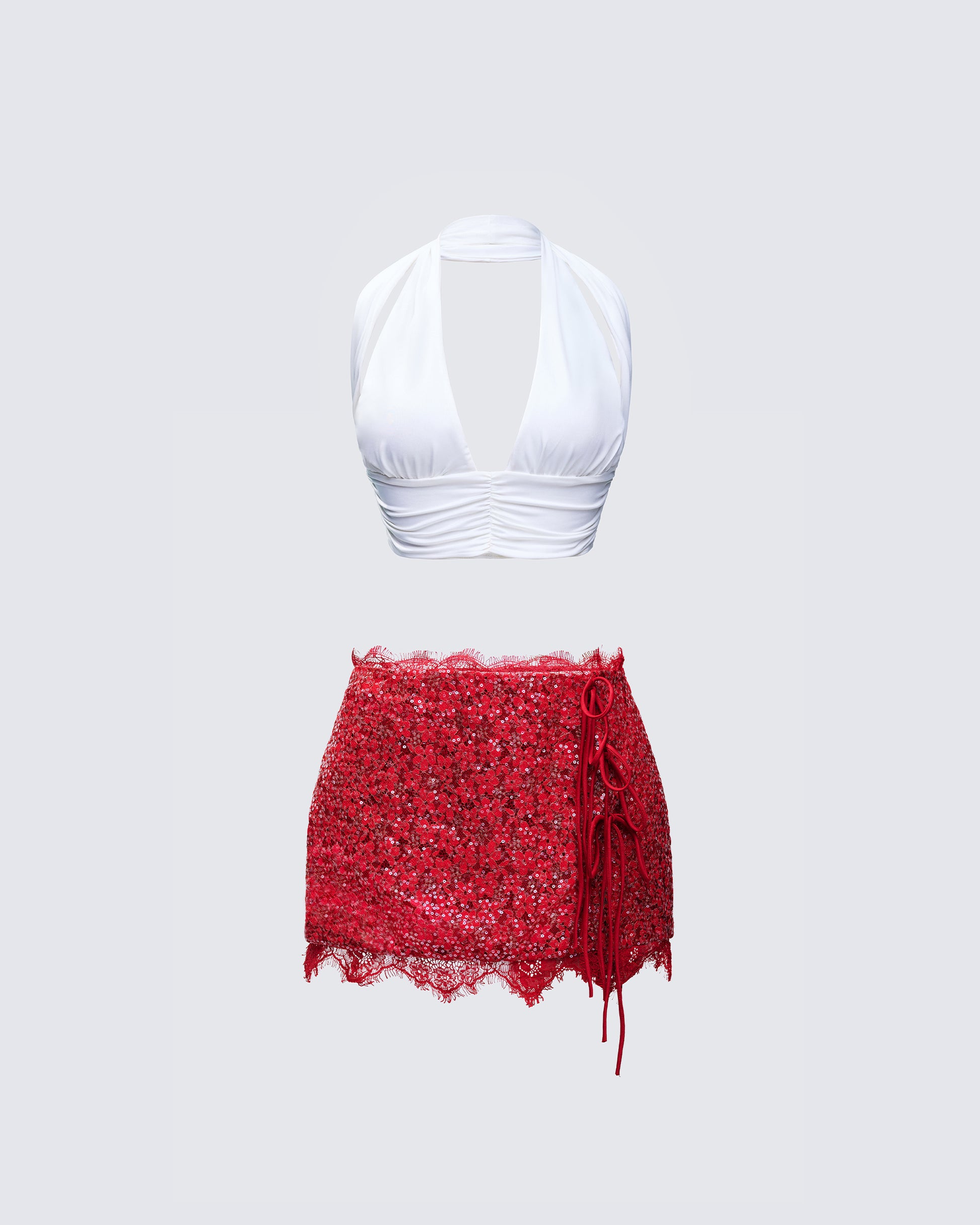 <p>Iyanu Ivory Jersey Halter Top: 95% Polyester, 5% Spandex</p><p>Lucille Red Sequin Tie Mini Skirt: 100% Polyester</p>