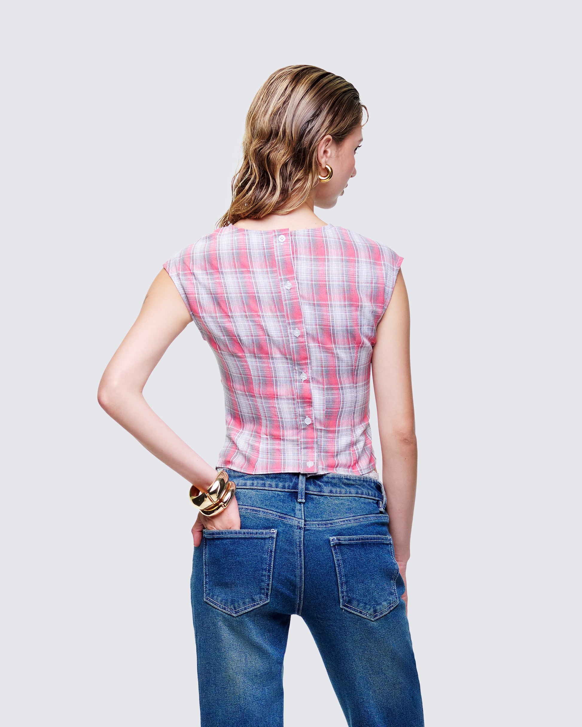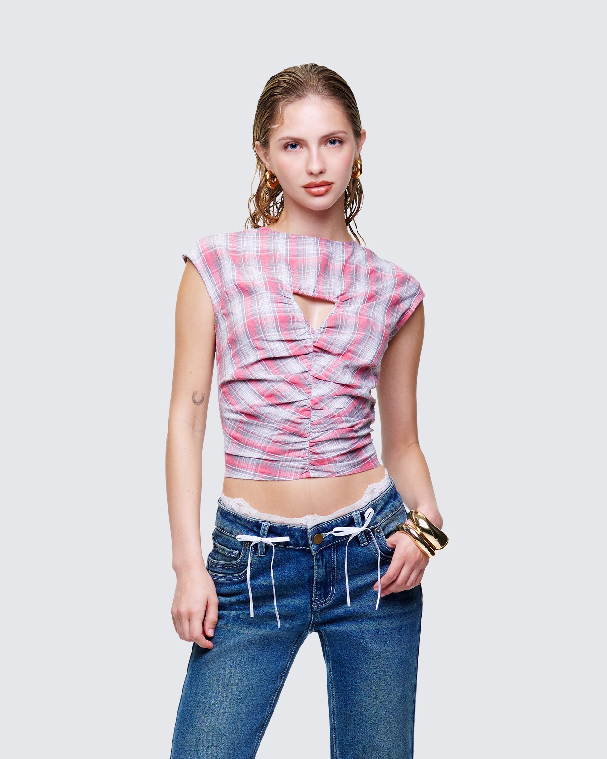 Plaid, but make it reckless ๐ This shirt plays with checks and cutouts, front gathers, and a peek of metal hardware for an edge thatโs anything but sweet ๐ย