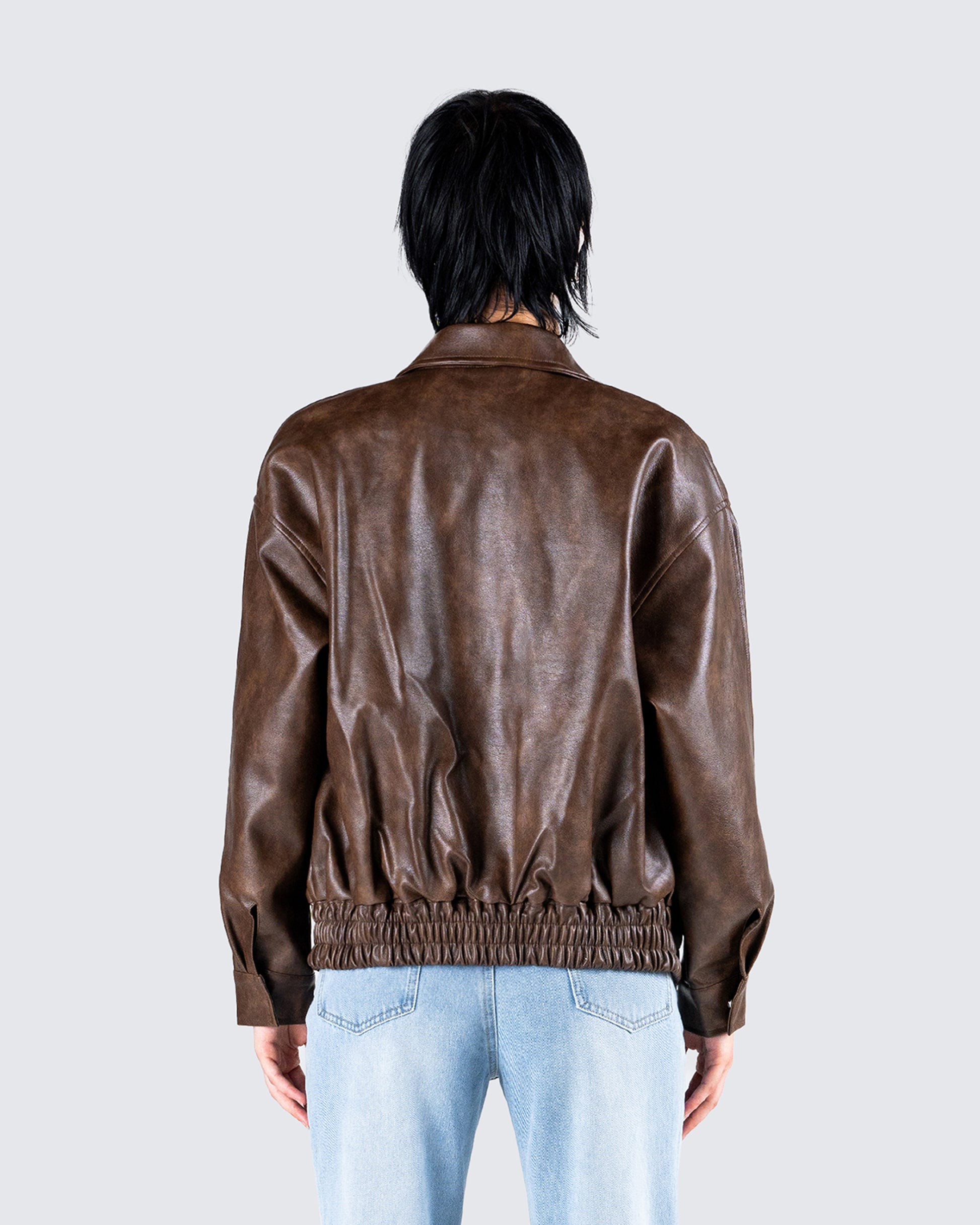 A leather jacket does wonders 🙌 With a chic look that will tie any outfit together perfectly - this brown vegan leather jacket features a fully lined design, a relaxed fit, and an elastic hem band 🤎