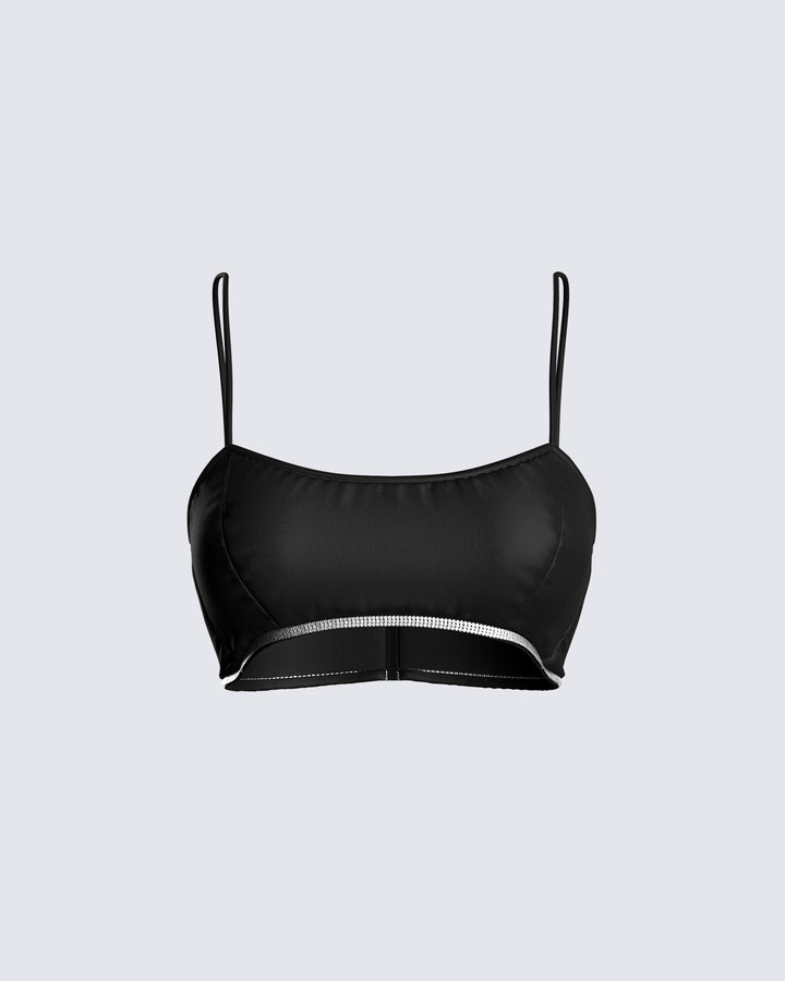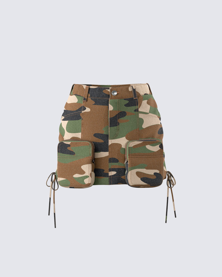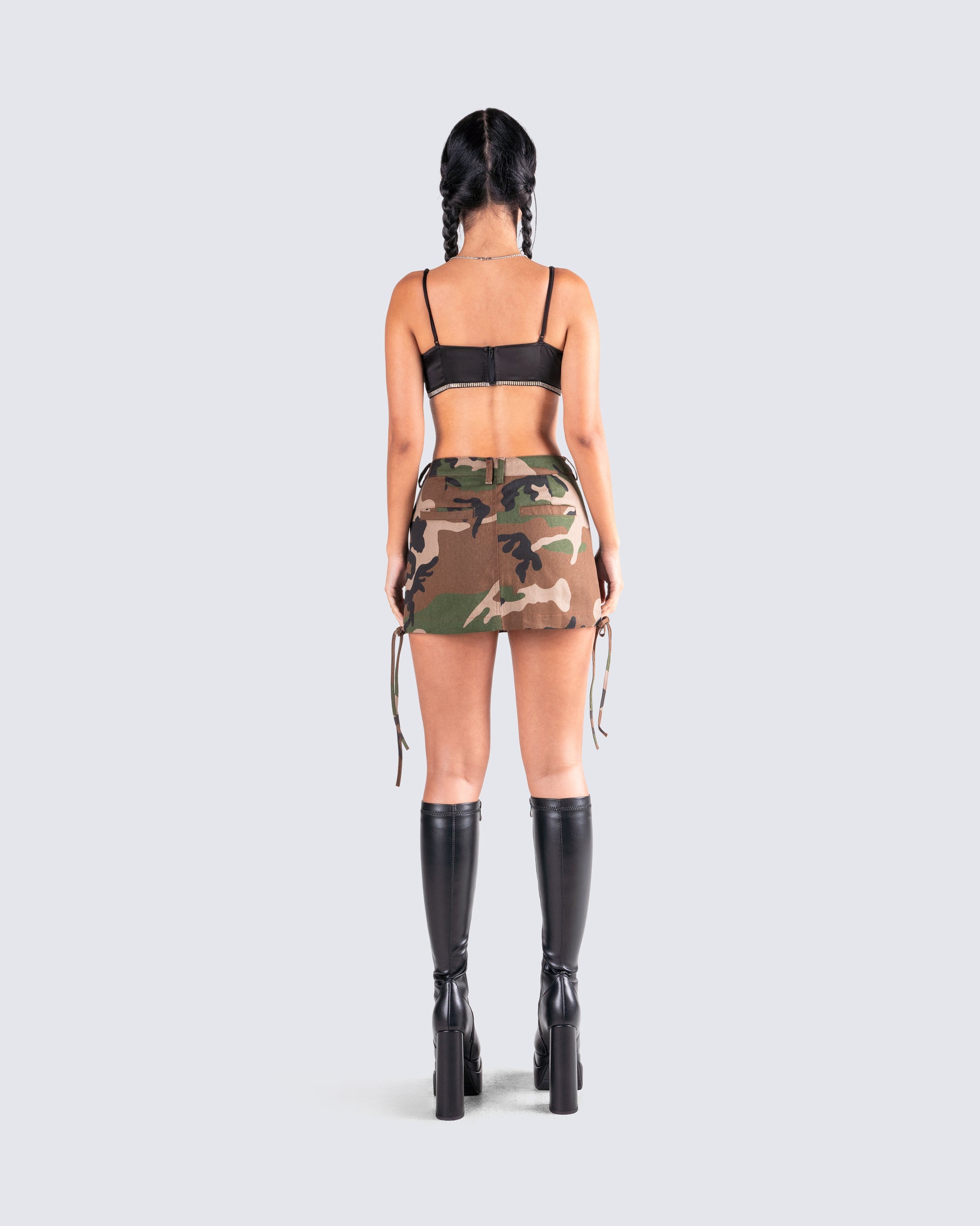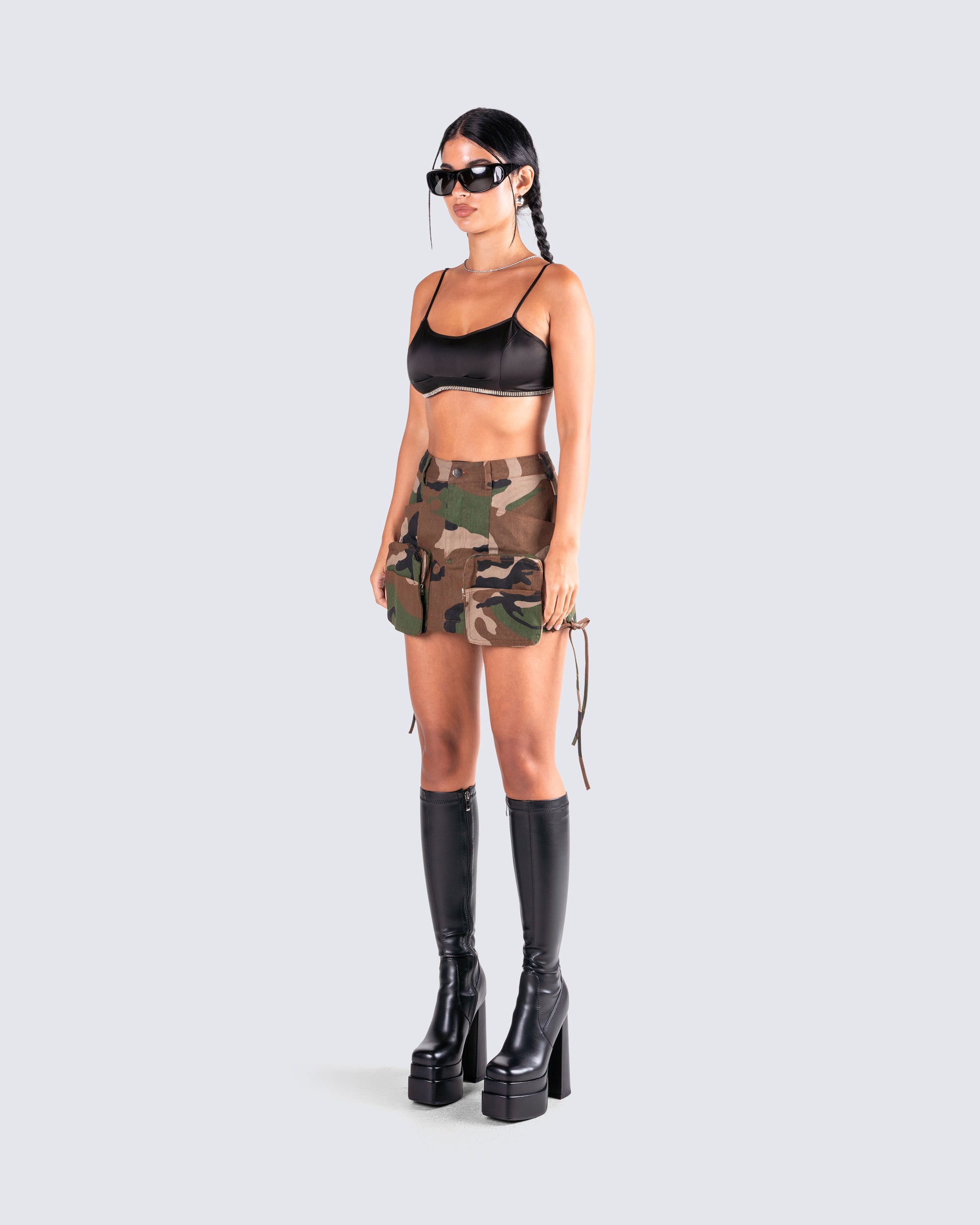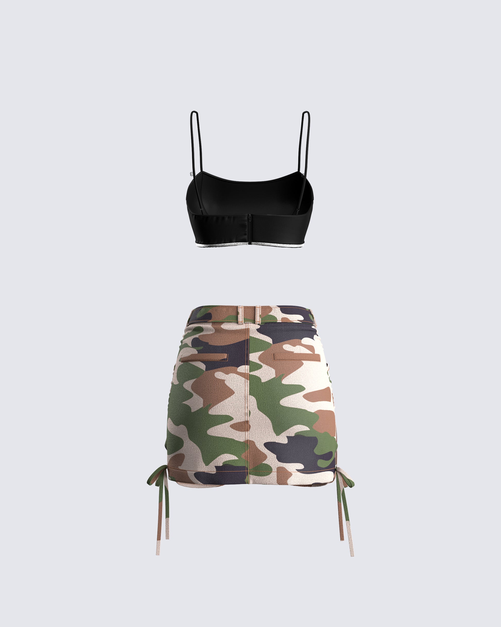 Take things to a new level in this two-piece set 💚 Featuring a black rhinestone trim top, paired with a camo zip pocket mini skirt - this fit will have everyone taking you seriously 😜