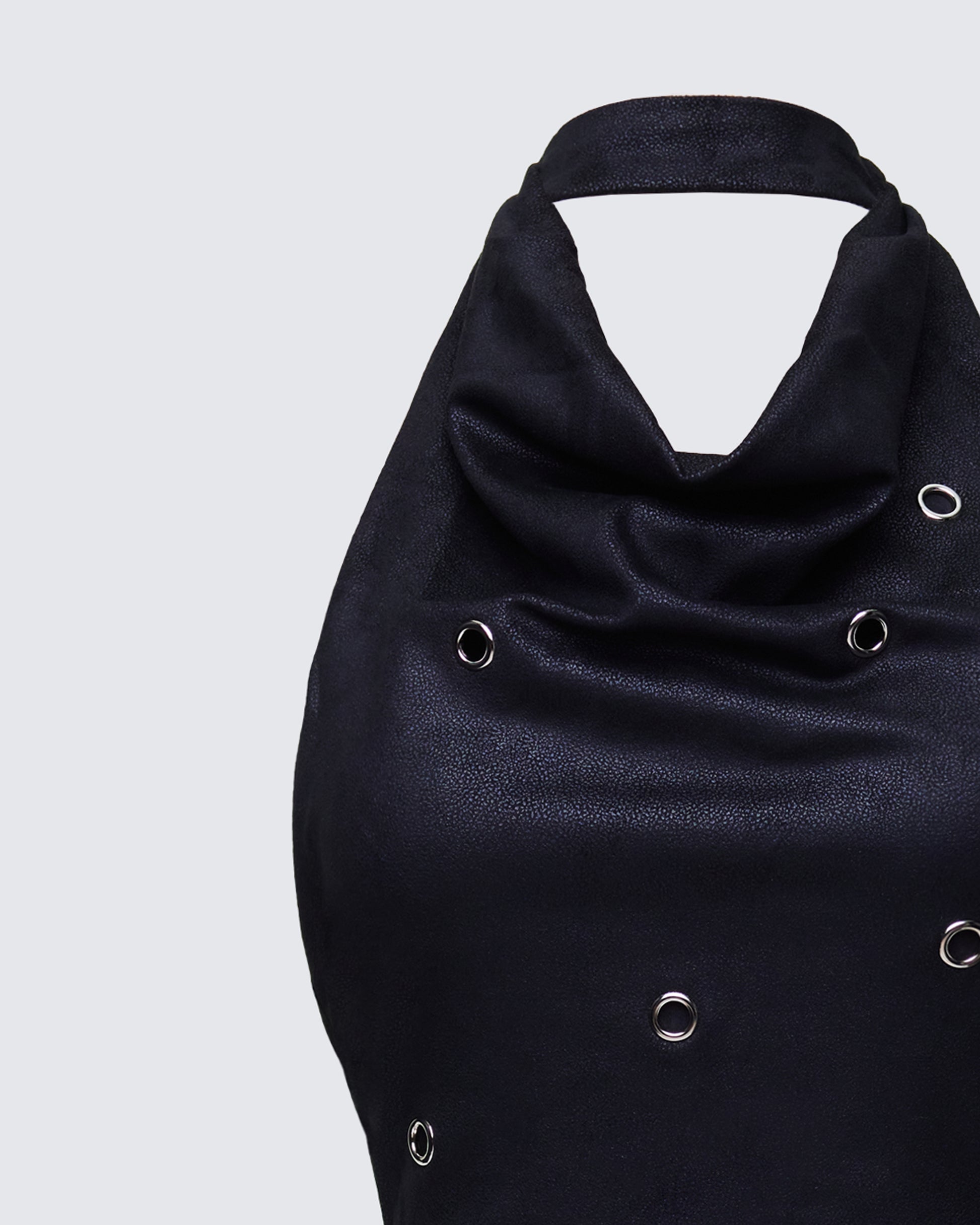 All eyes on the eyelets ๐ค This halter mini, made from soft-touch faux leather with all-over metal eyelet trim and a cowl neckline, was designed for when youโre the plot twist and the problem ๐