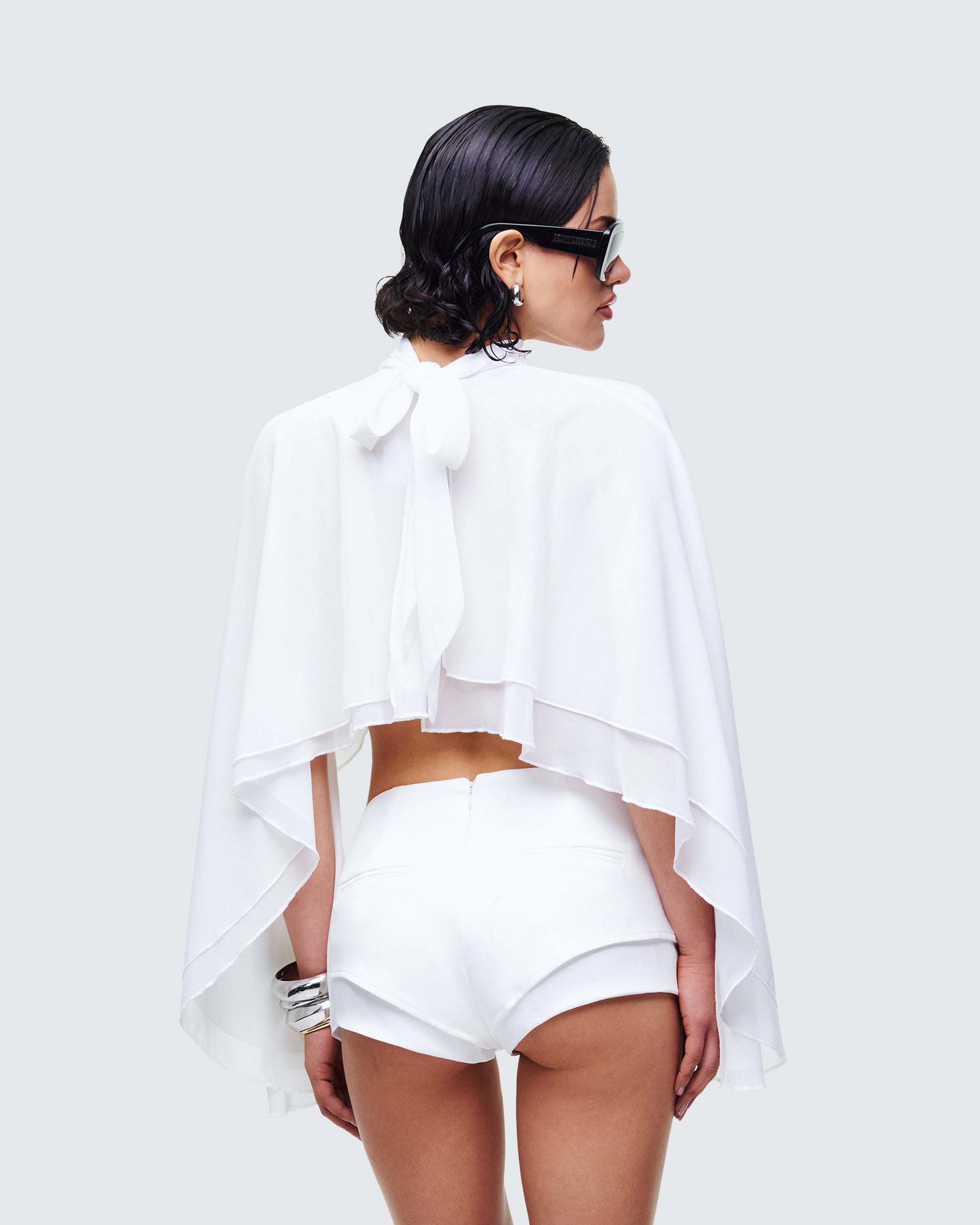 Light as air, heavy on the drama 👑 This flowing georgette cape features a sculptural drape and open back that makes every entrance feel intentional 🤍