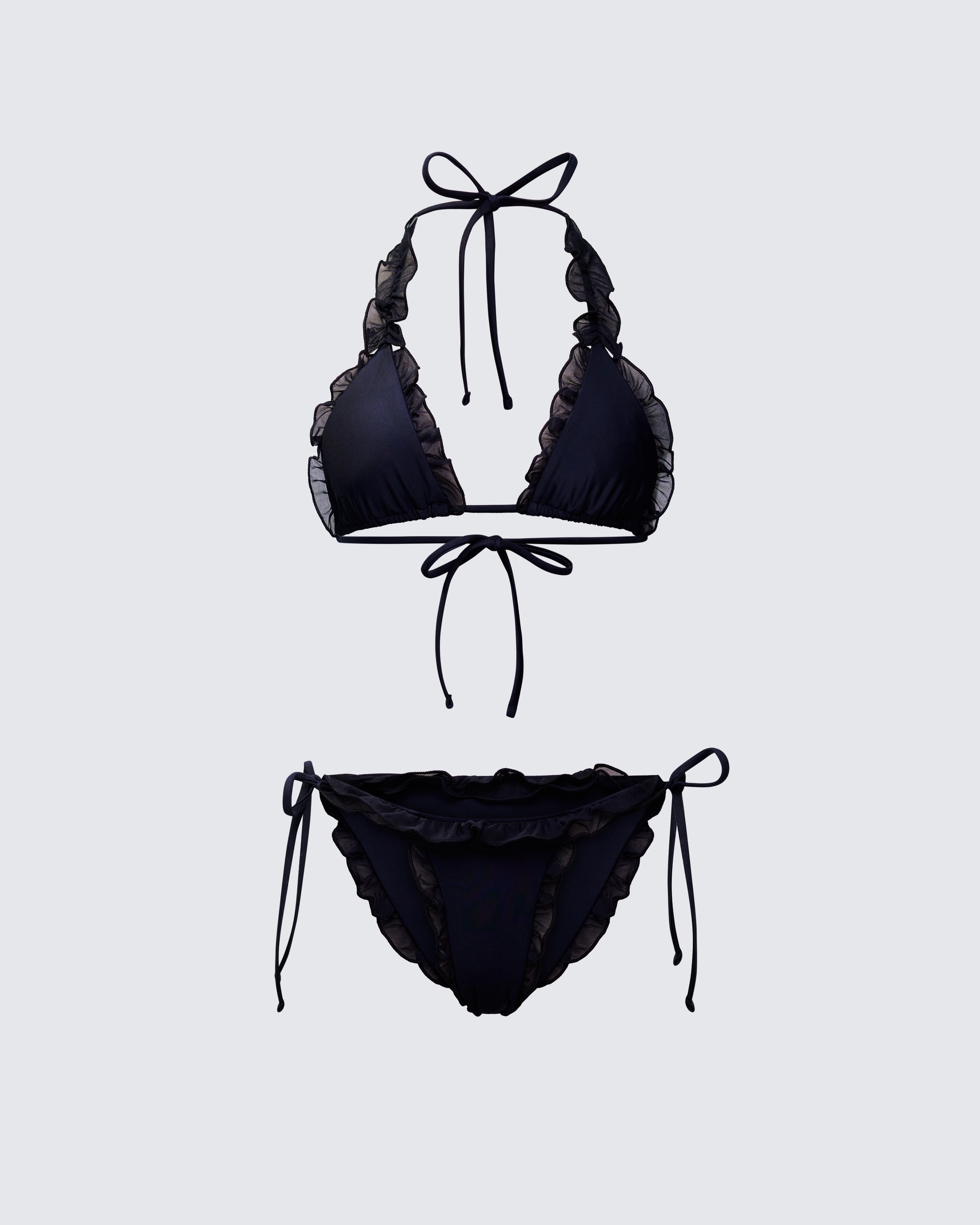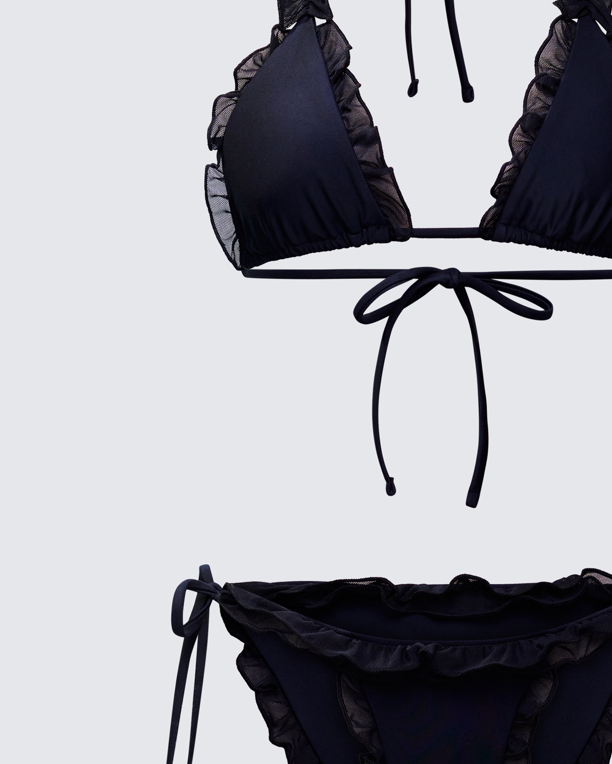 Timeless, but not tame ๐ This bikini set takes the iconic triangle bikini and flirts it up with mesh ruffles along the edges. Itโs basically the little black bikini, rewritten ๐ค