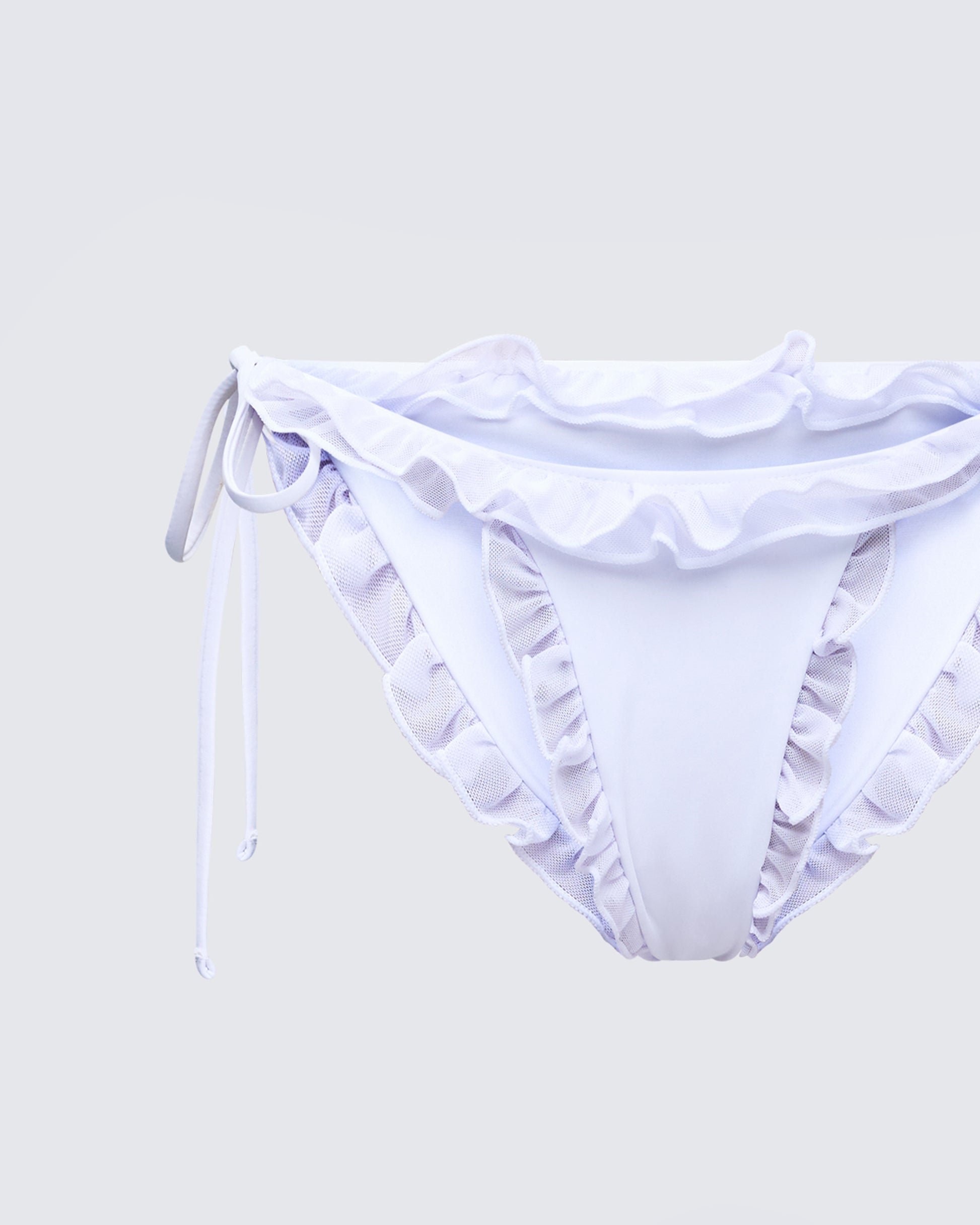 Flirty from the front, cheeky from the back 😏 With tie sides and frilly ruffles, these bottoms are as fun as they are hot 🤍