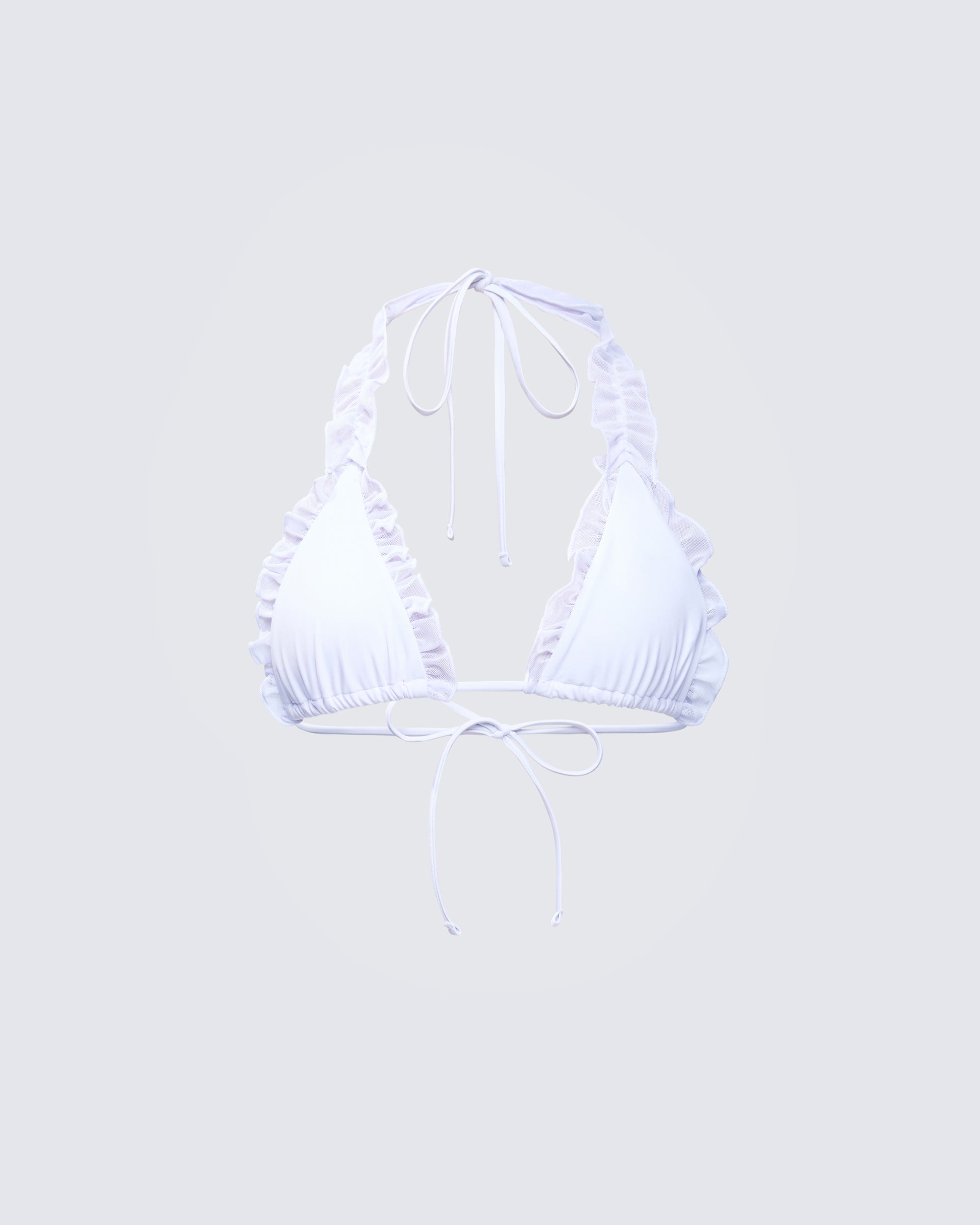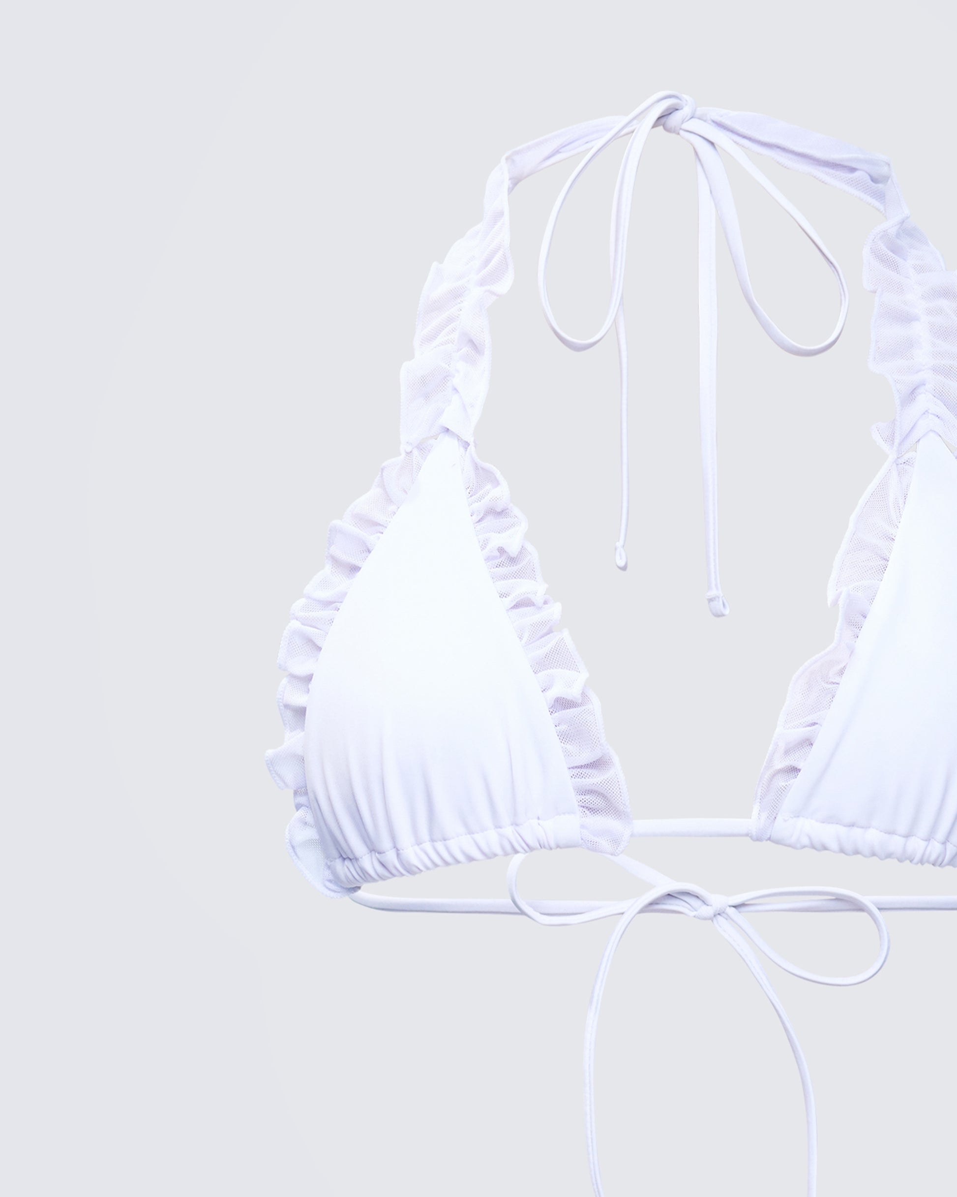 This bikini top is a soft girl’s secret weapon 😙 Ruffle trims frame the tiniest triangle cut, proving you can be both playful and provocative at the same time 🤍