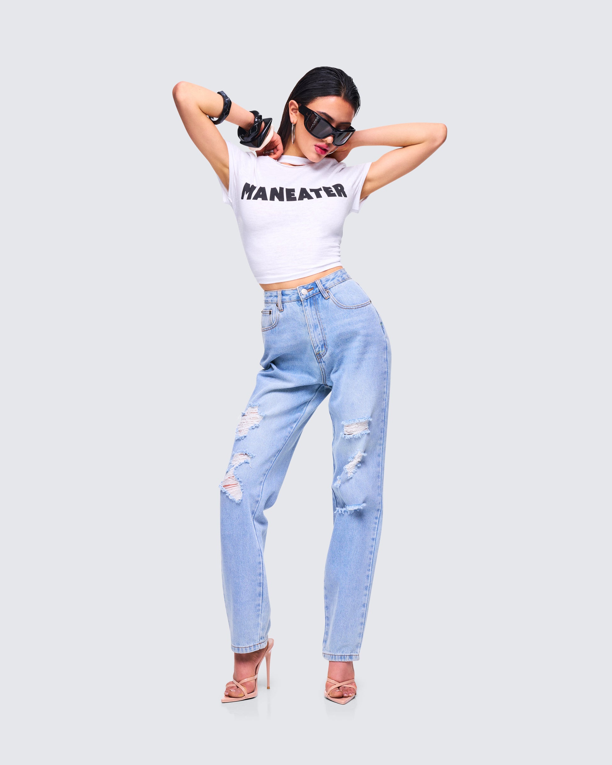 You're not one for the faint of heart, bby 😈 This is the top to wear when you want to make it clear you are not to be messed with. Made from a slub jersey fabric, and complete with a collar cut out, rolled sleeves, and shirring detail, and a "MANEATER" graphic 🖤
