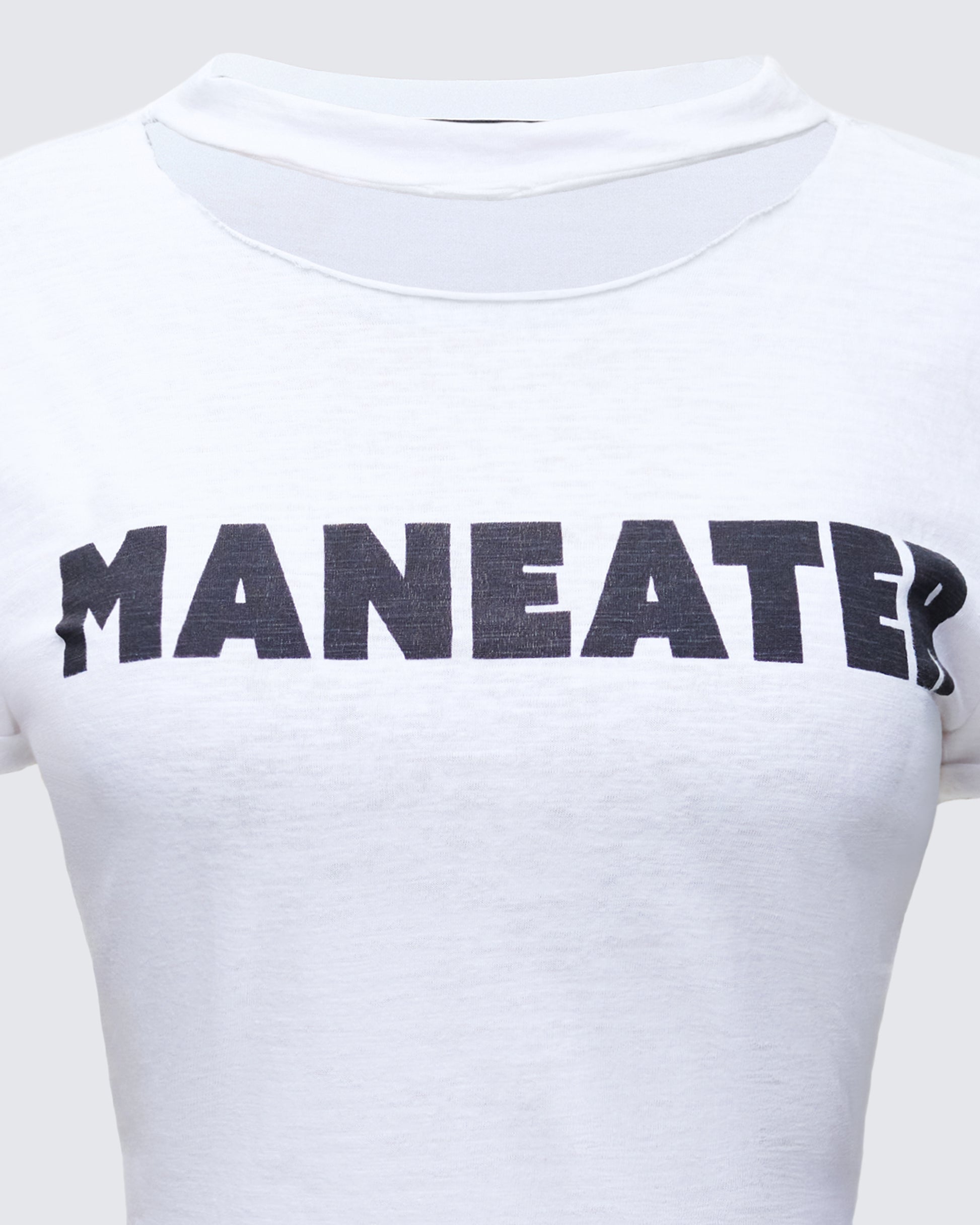 You're not one for the faint of heart, bby 😈 This is the top to wear when you want to make it clear you are not to be messed with. Made from a slub jersey fabric, and complete with a collar cut out, rolled sleeves, and shirring detail, and a "MANEATER" graphic 🖤