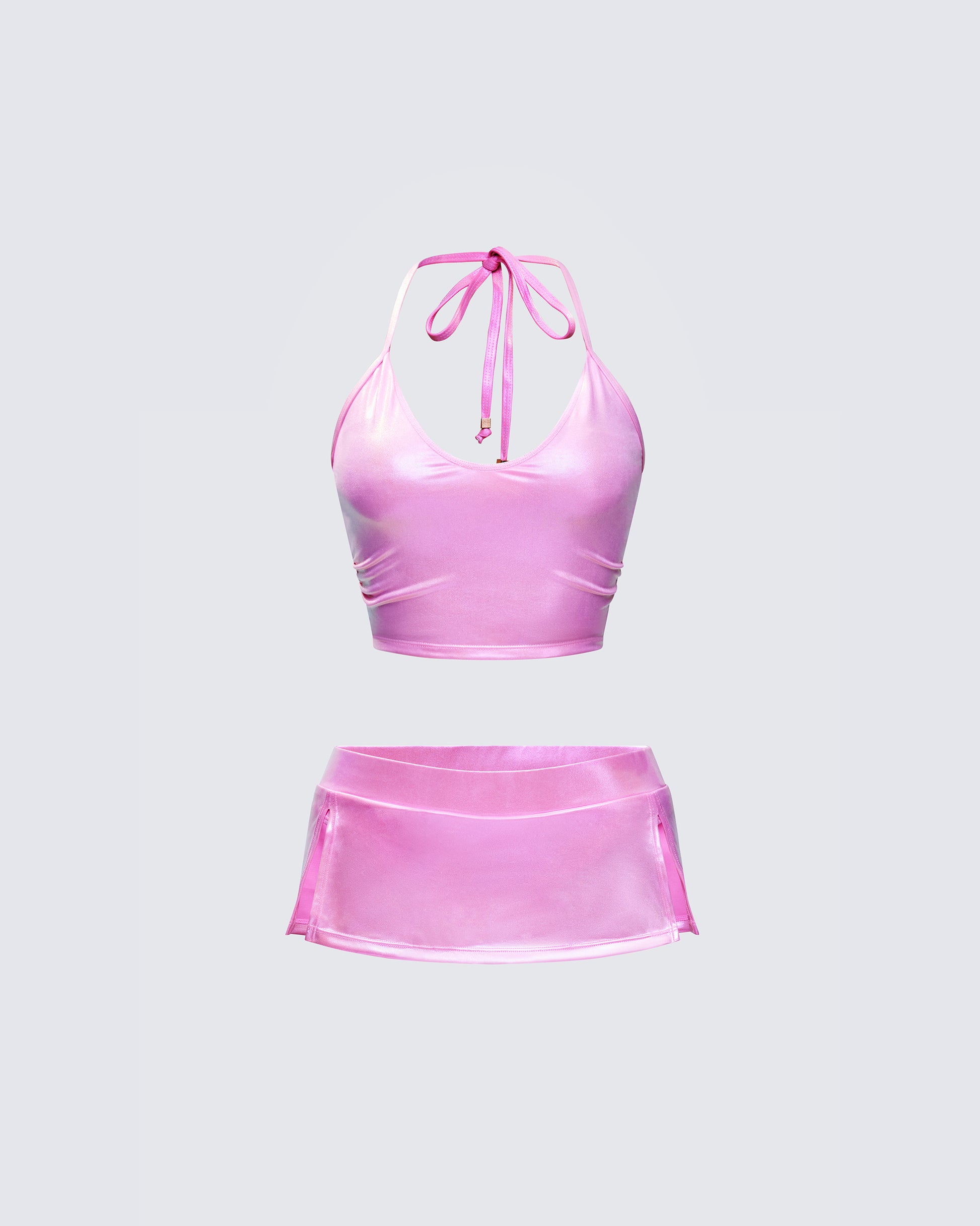 Pink, shiny, and made to misbehave π This metallic dream takes you from sunrise swims to after-dark chaos without breaking a sweat. Subtlety isnβt in her vocabulary π