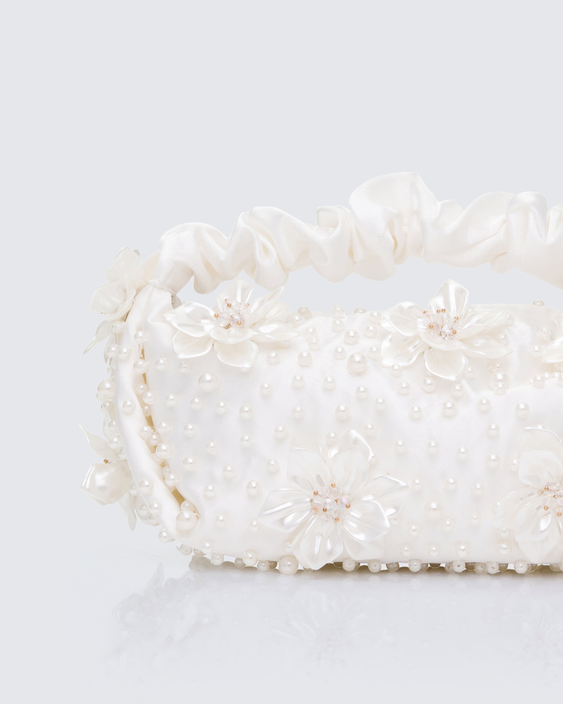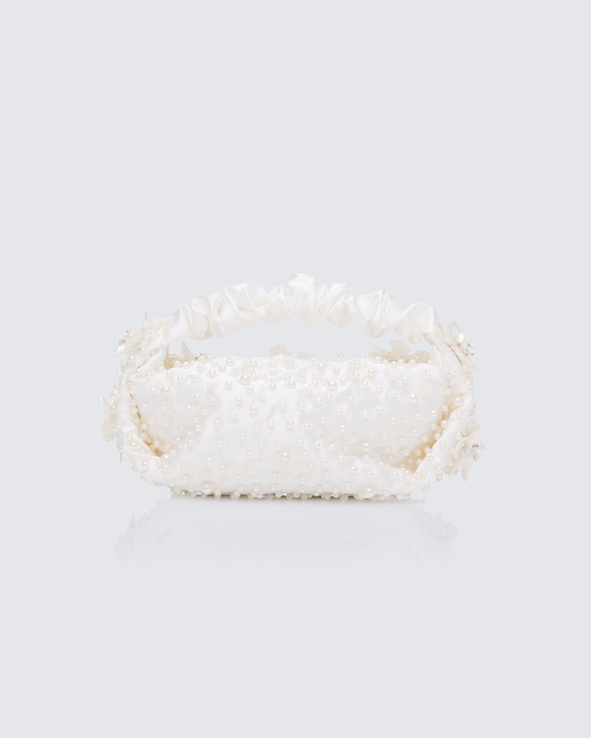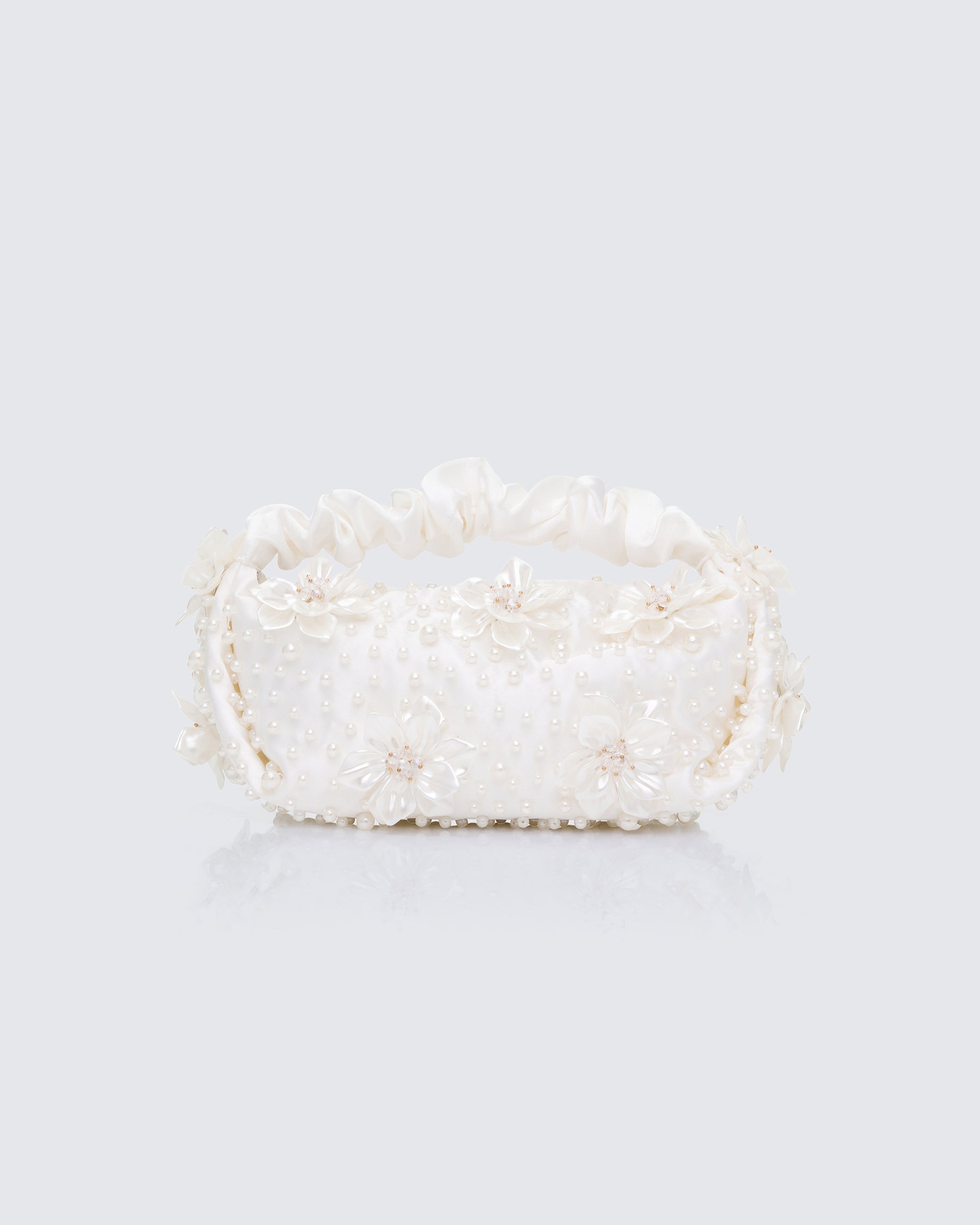 The prettiest plus-one you’ll ever bring 💌 Complete with ivory satin, pearl-studded flowers, a kiss-lock closure and chain strap - she’s built for all your happily-ever-afters 🤍