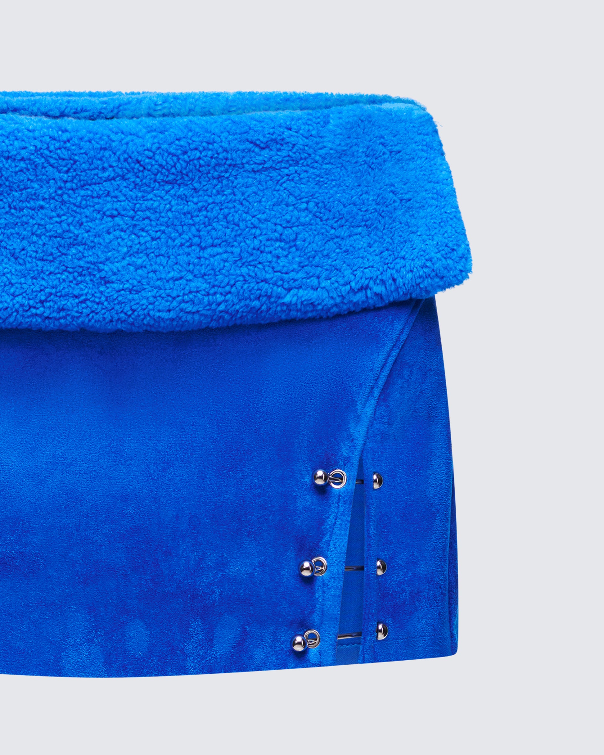 Sleek, fierce, and unapologetic. Electric blue vegan shearling, pierced with statement silver detailing to add a little edge. 🪩 Match it or mix it; either way, you’re setting the tone😌