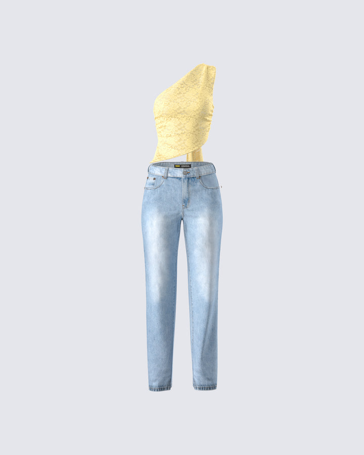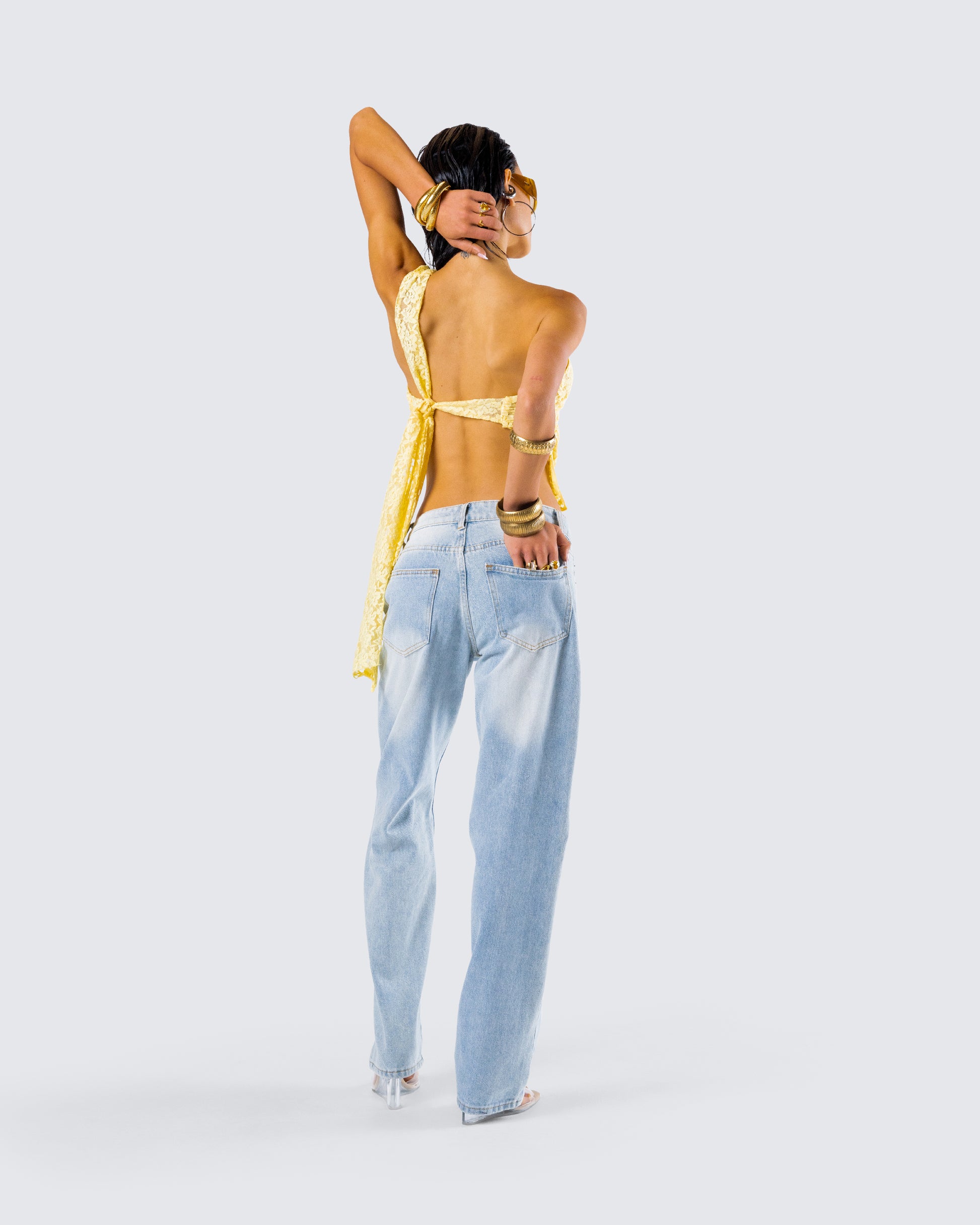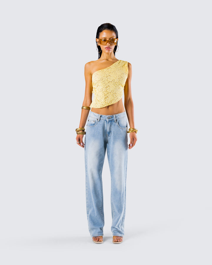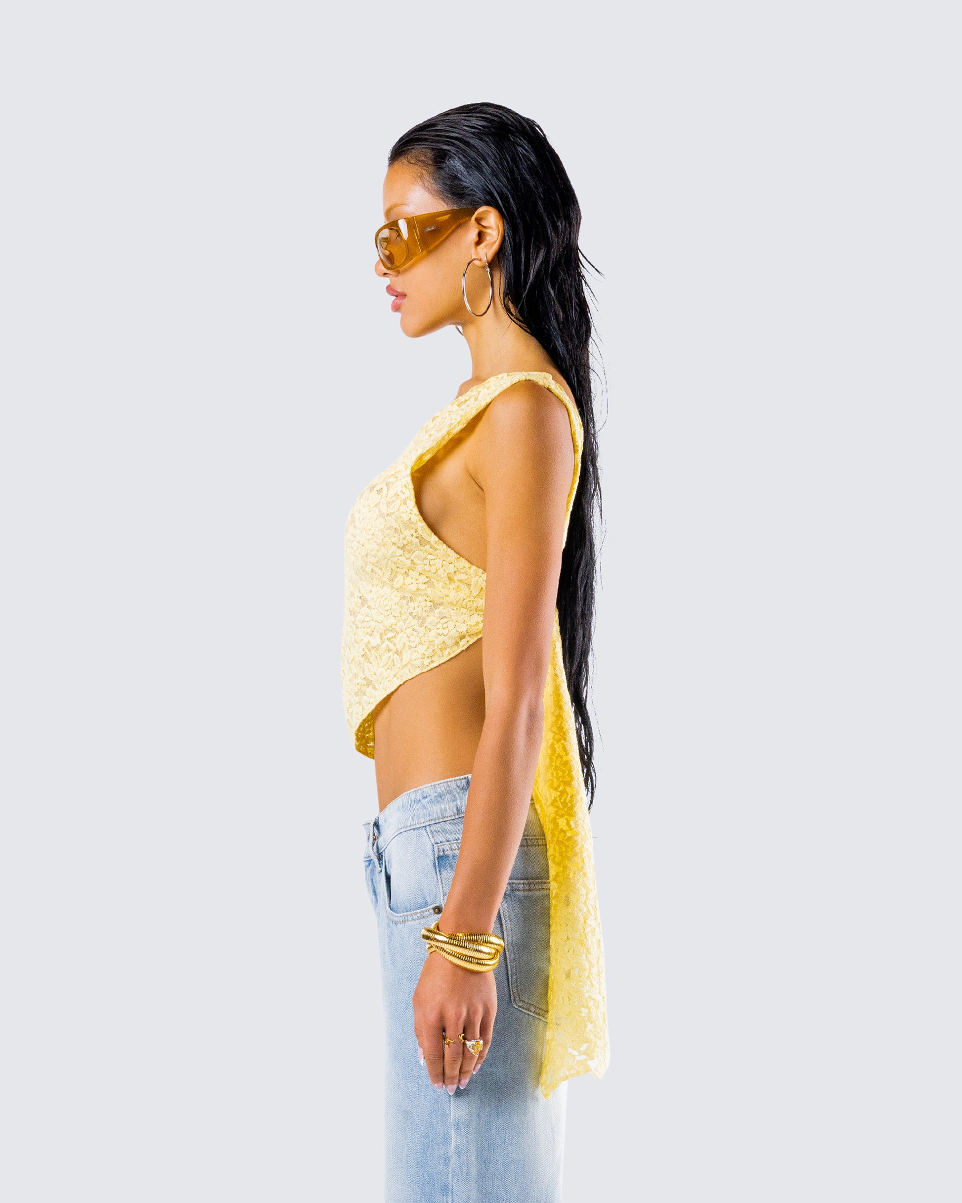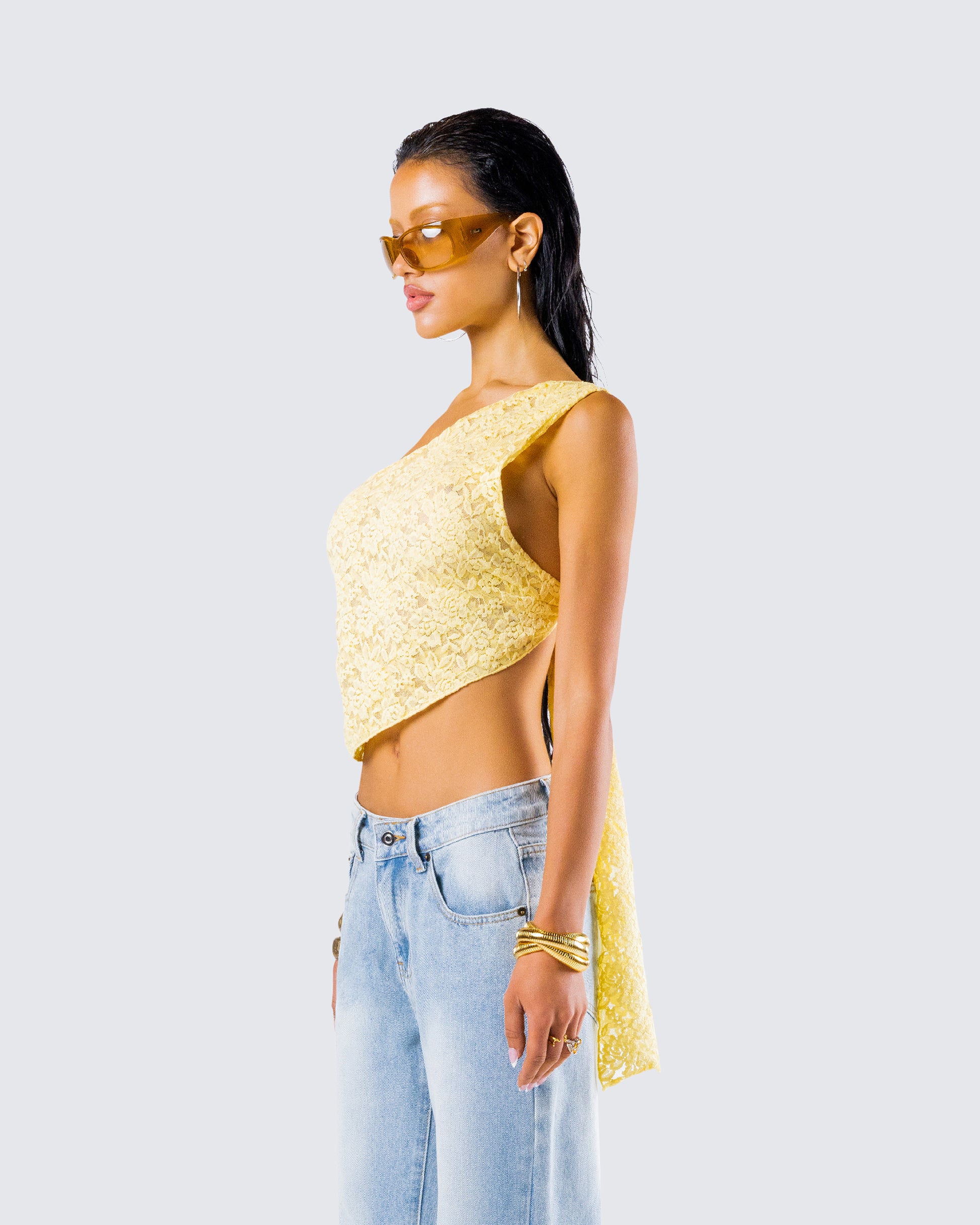 A soul full of sunshine ☀️ Brighten up their days in this yellow top made from lace fabric and complete with strap ties at the back, and an asymmetrical fit 💛