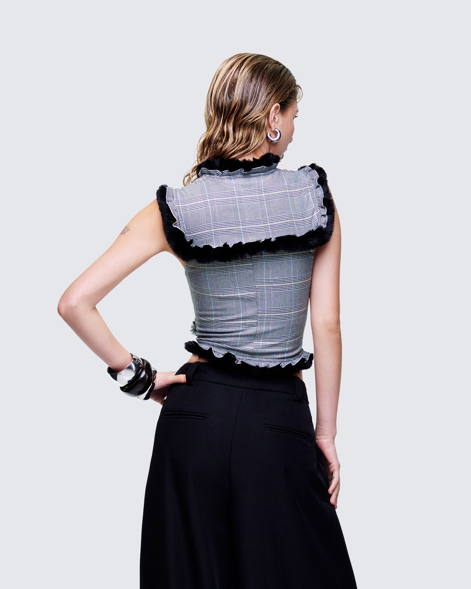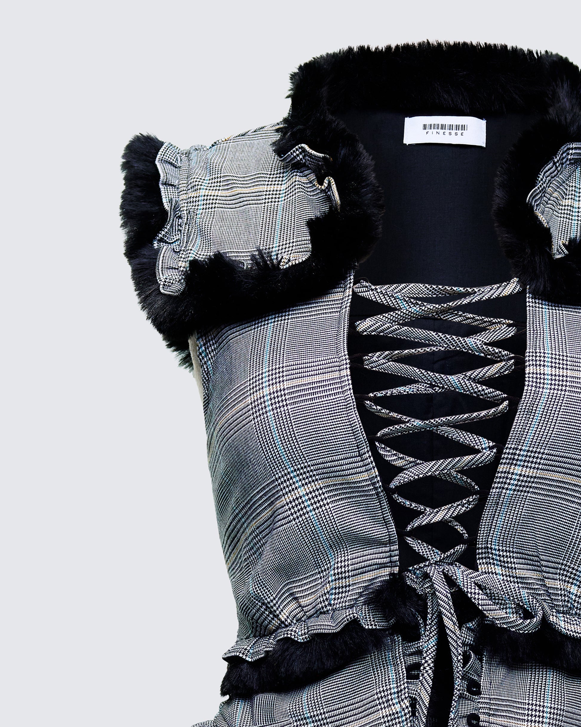 Forget buttoned-up plaid, this top didn’t come to play polite 😏The corset-style lace-up front feels risky, while the oversized faux-fur collar adds a hit of drama you can’t ignore 🖤