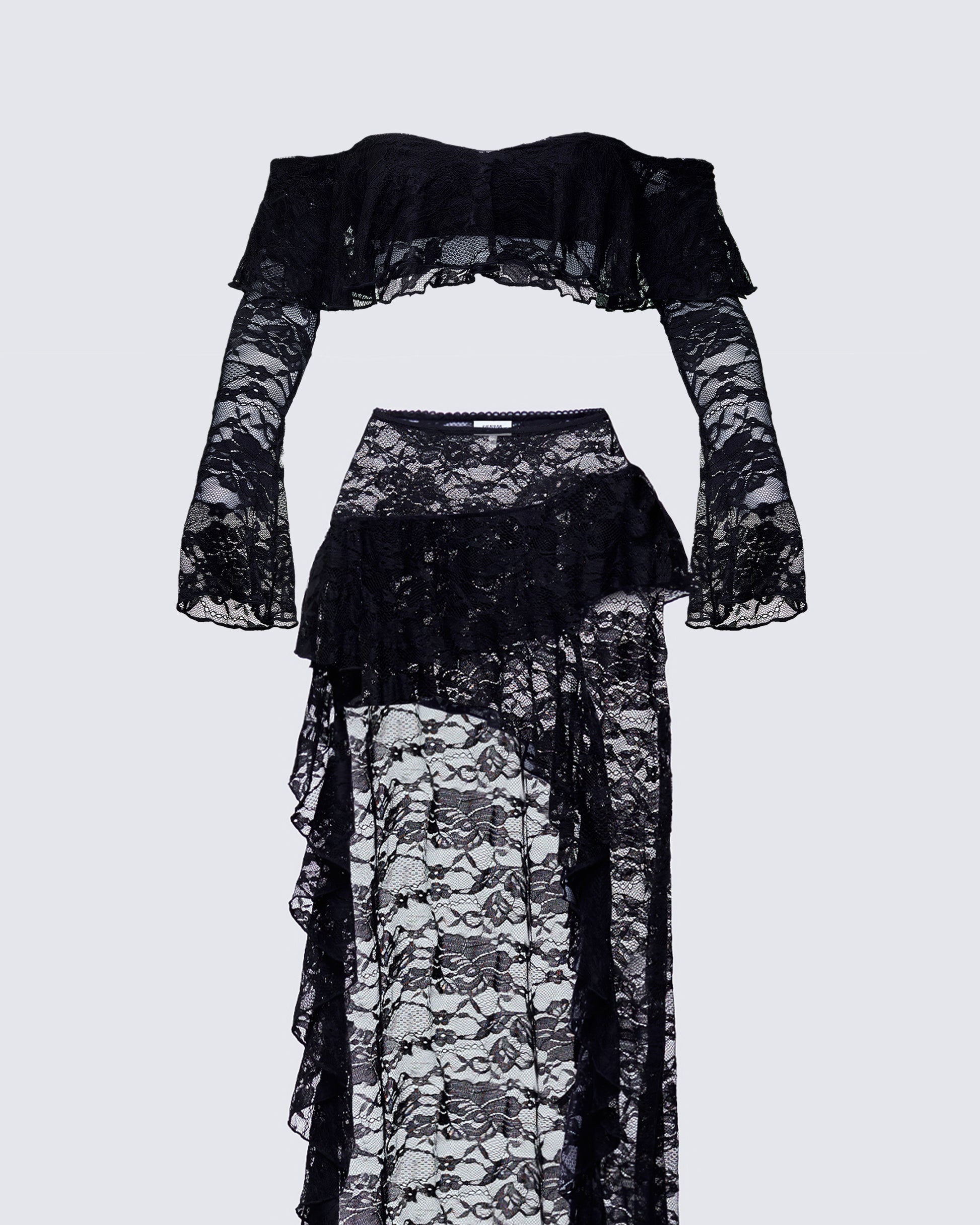 Rina Black Lace Asymmetrical Hem Ruffle Skirt