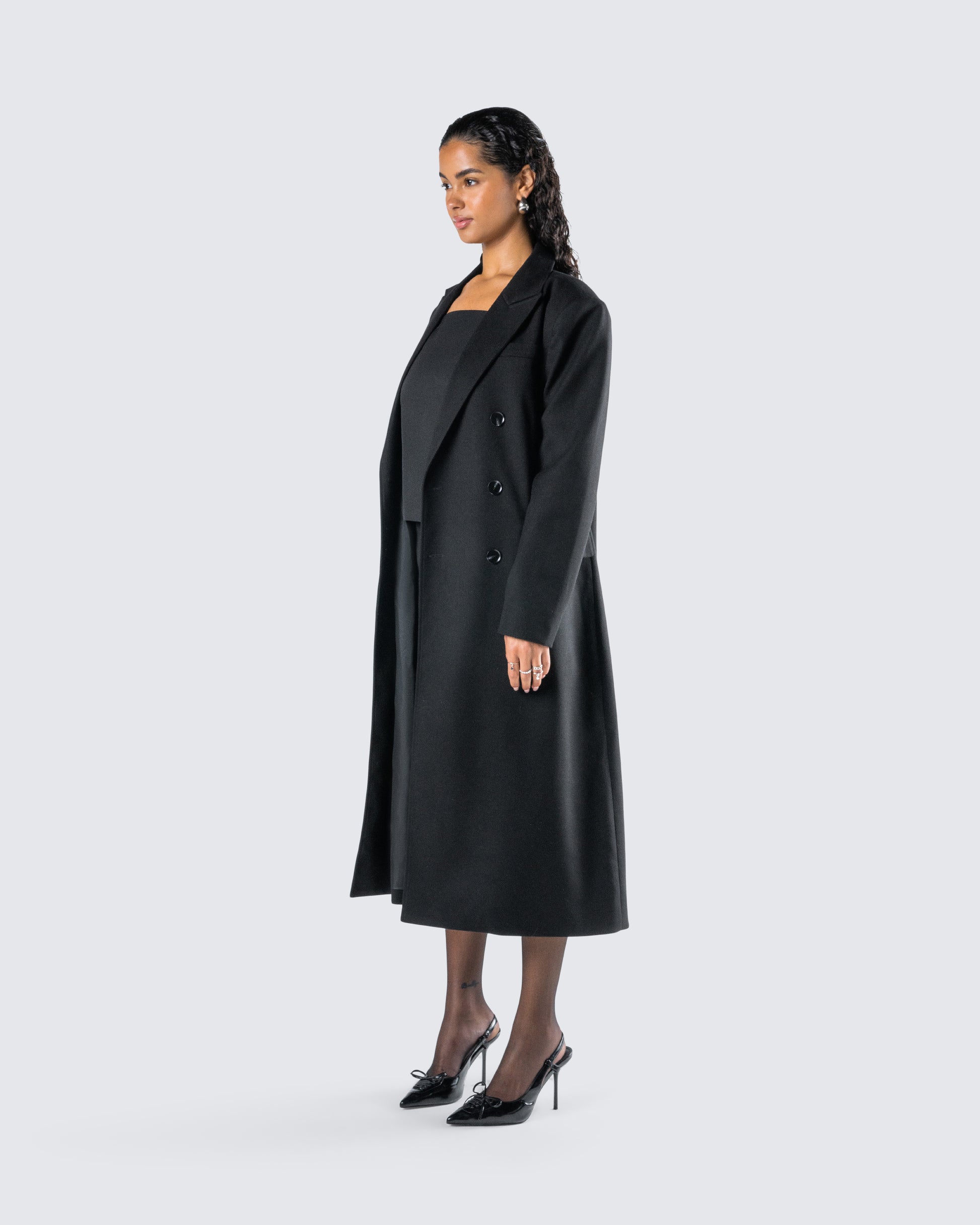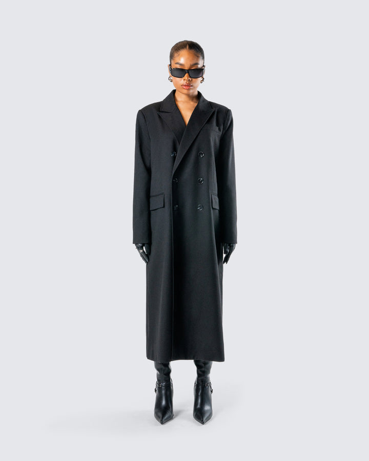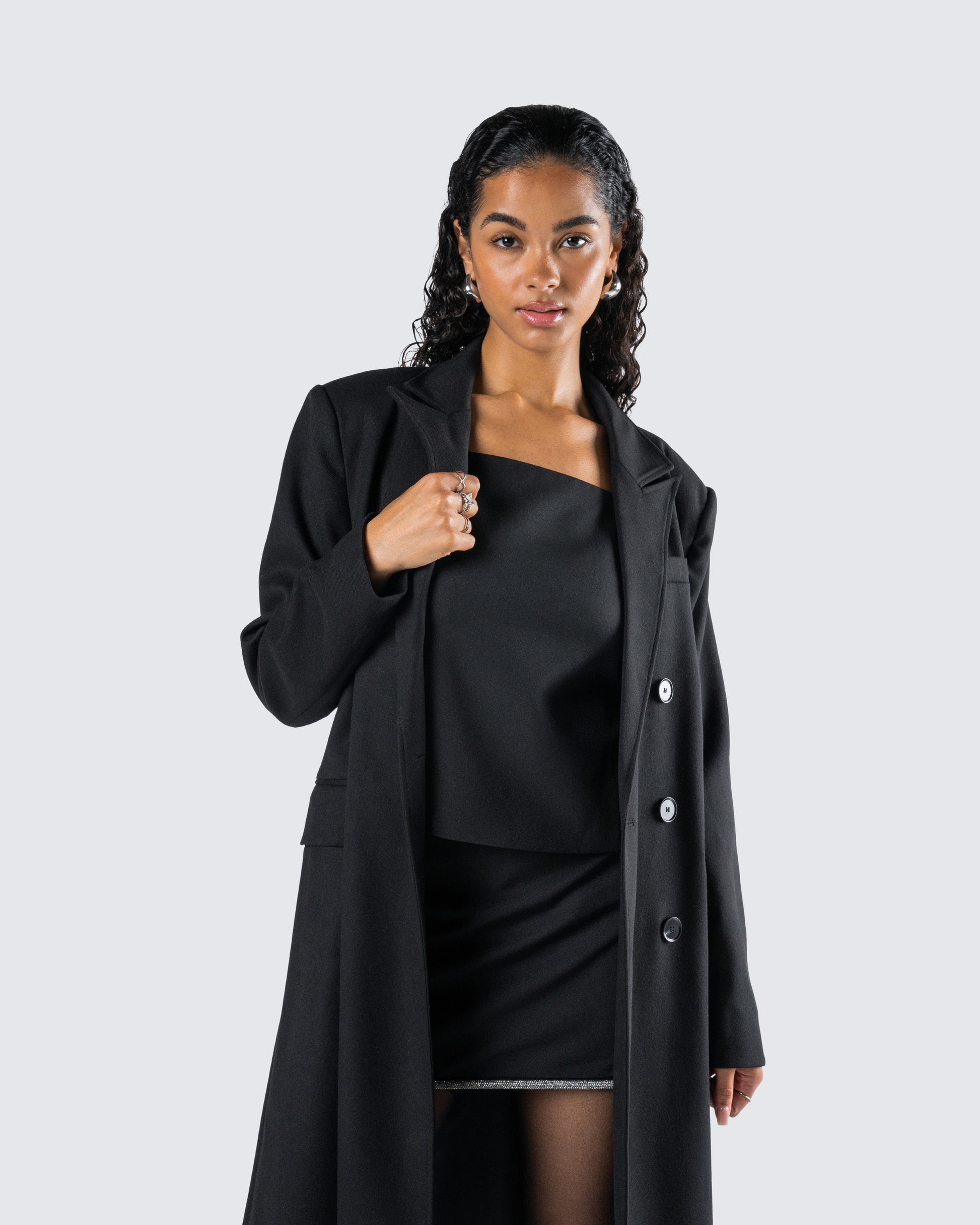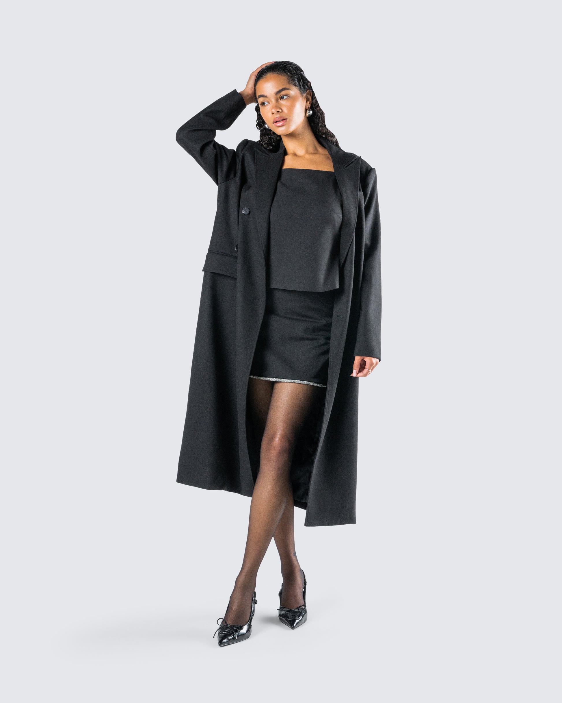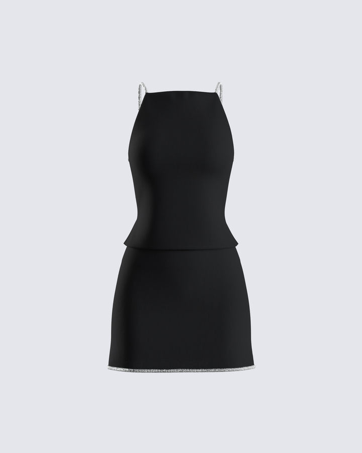 The perfect fit for our babes who truly mean business π Featuring a black double-breasted coat and a matching rhinestone top and mini skirt - this three-piece set will have them willingly taking orders π€