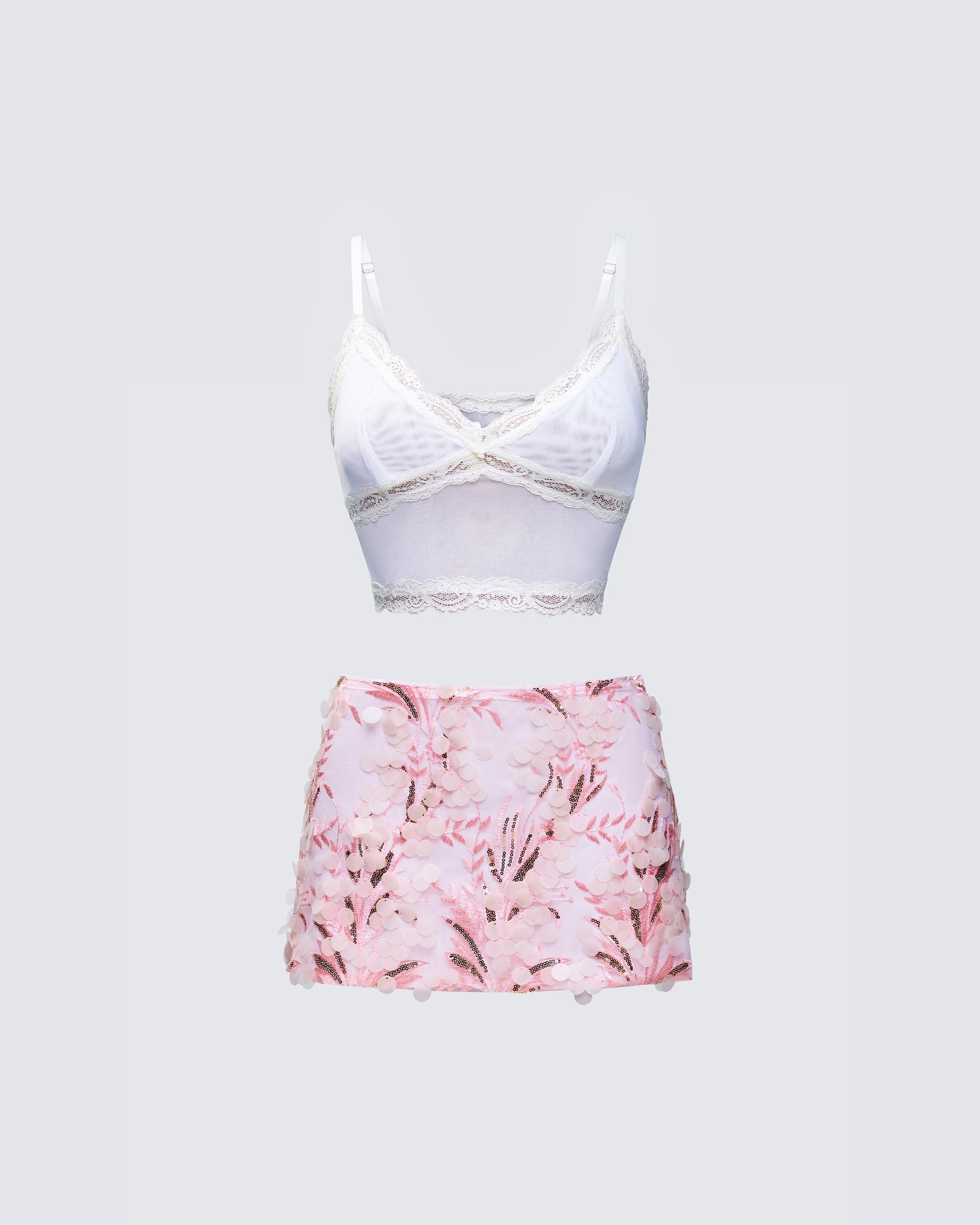 This set was made for the divas who love sweet details with a glam twist π The lace cami keeps things delicate, while the pink embellished mini brings just enough shine to take it next-level π