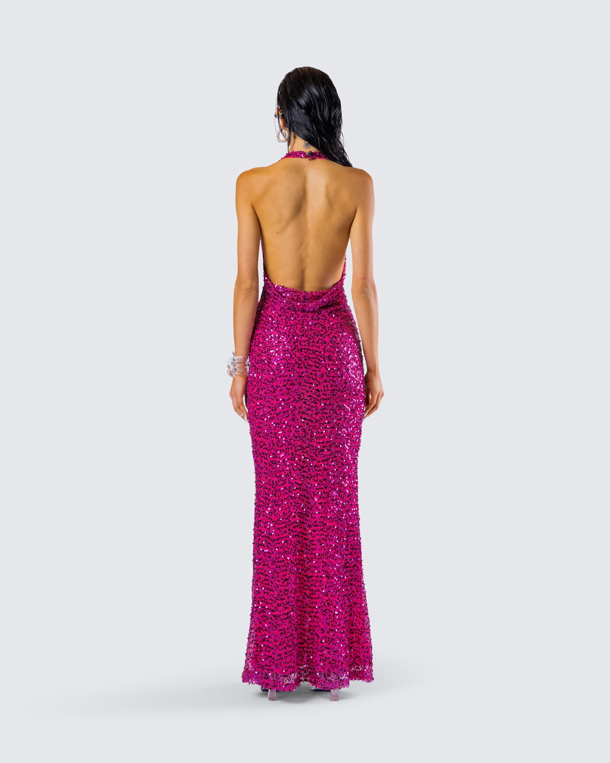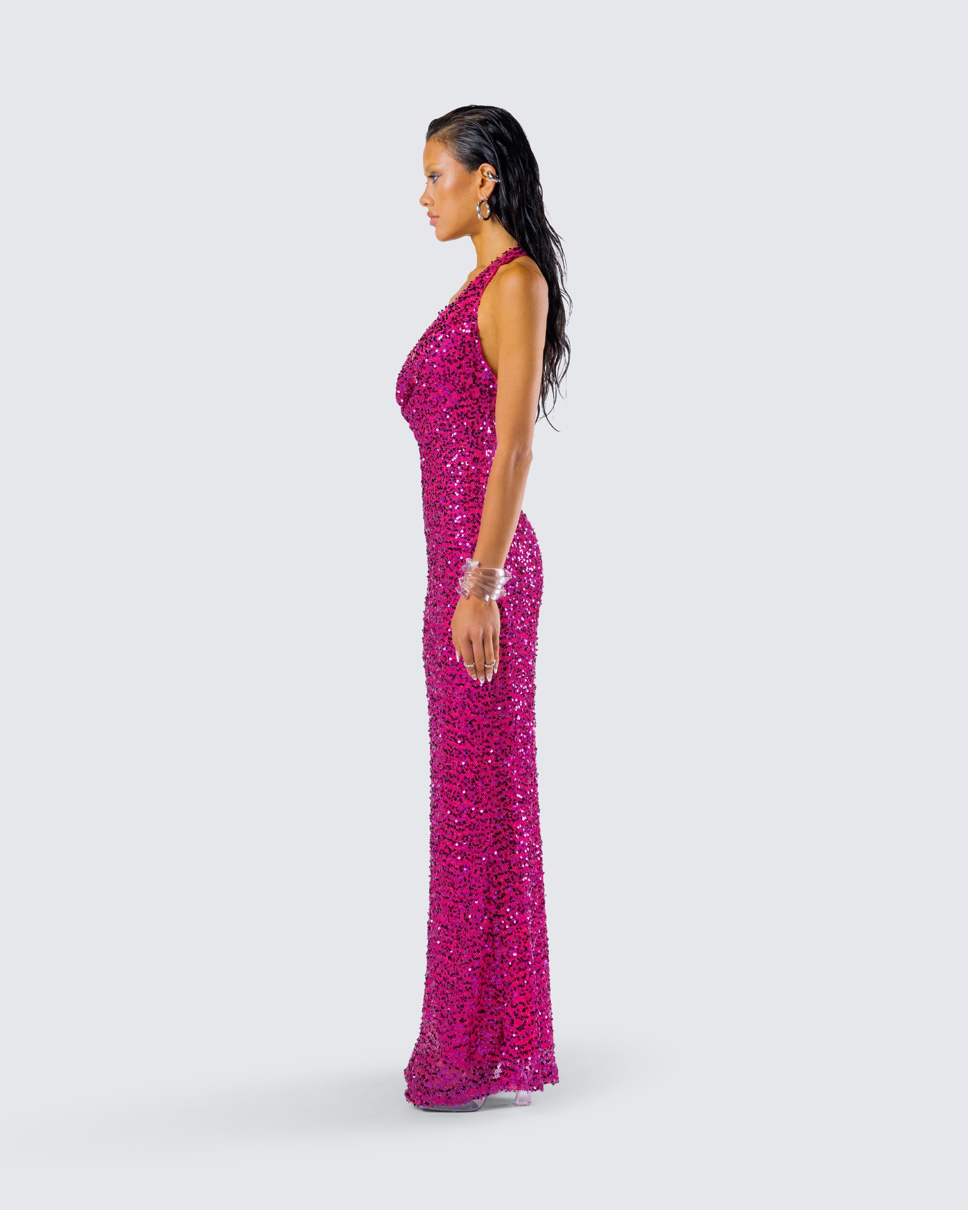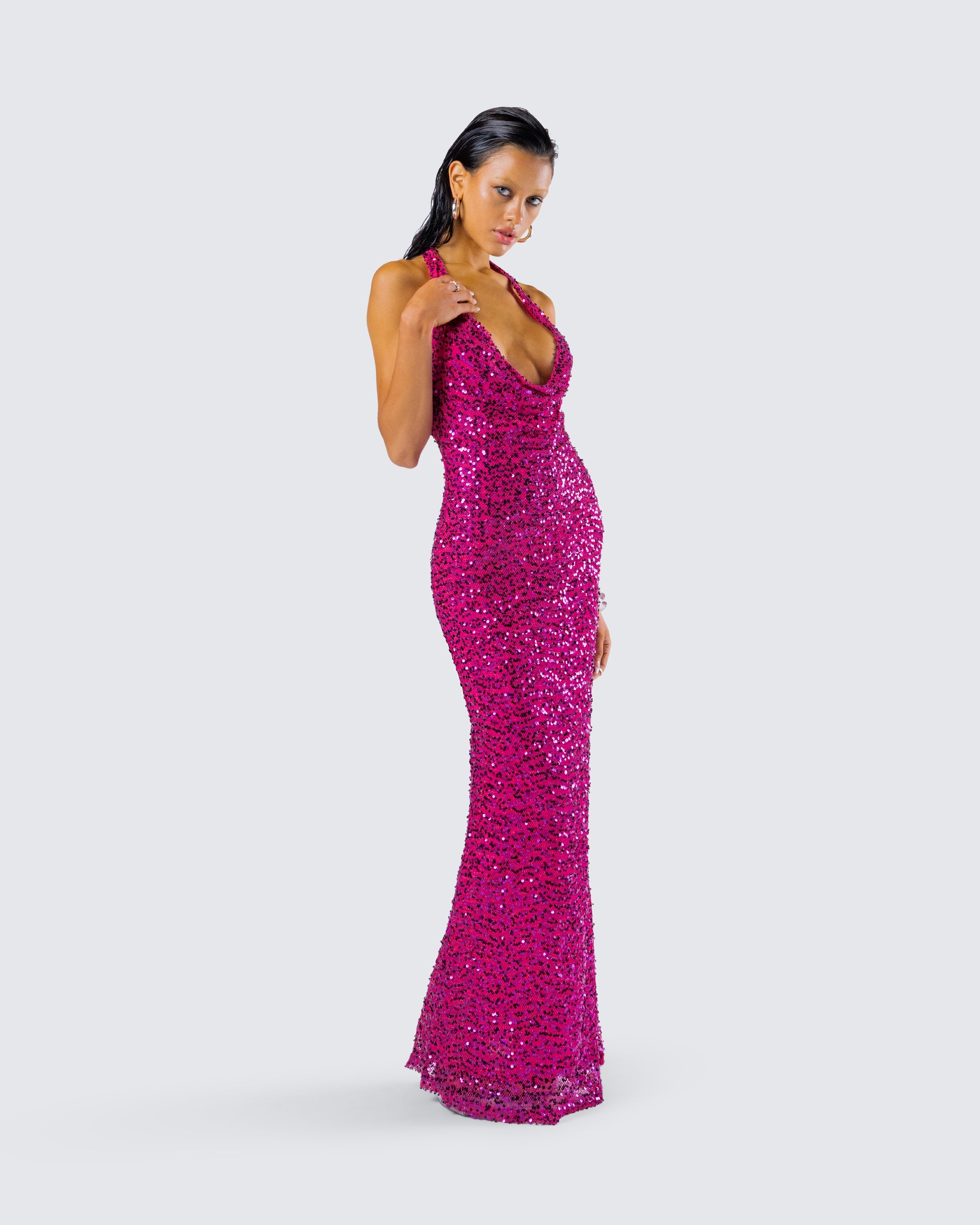 Have everyone moving out of the way for you when you walk in wearing this gown 💜 With a bodycon fit, this pull-on style made from knit fabric with sequins is bound to get you the royal treatment you deserve 👑