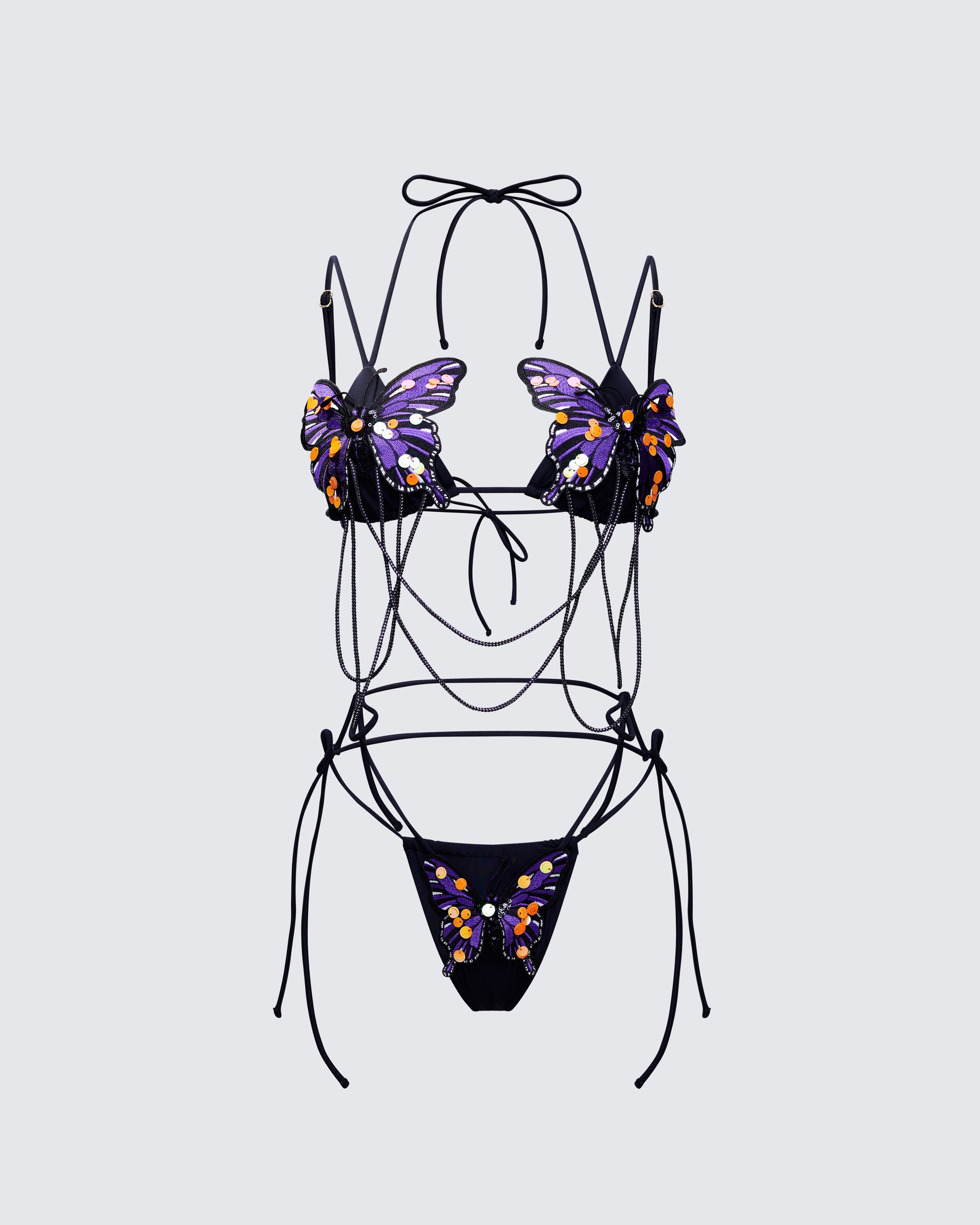 Call it metamorphosis, but make it sexy 🖤 This set transforms the classic string bikini into a full-blown spectacle with sequin butterfly appliqués and chain details 🦋