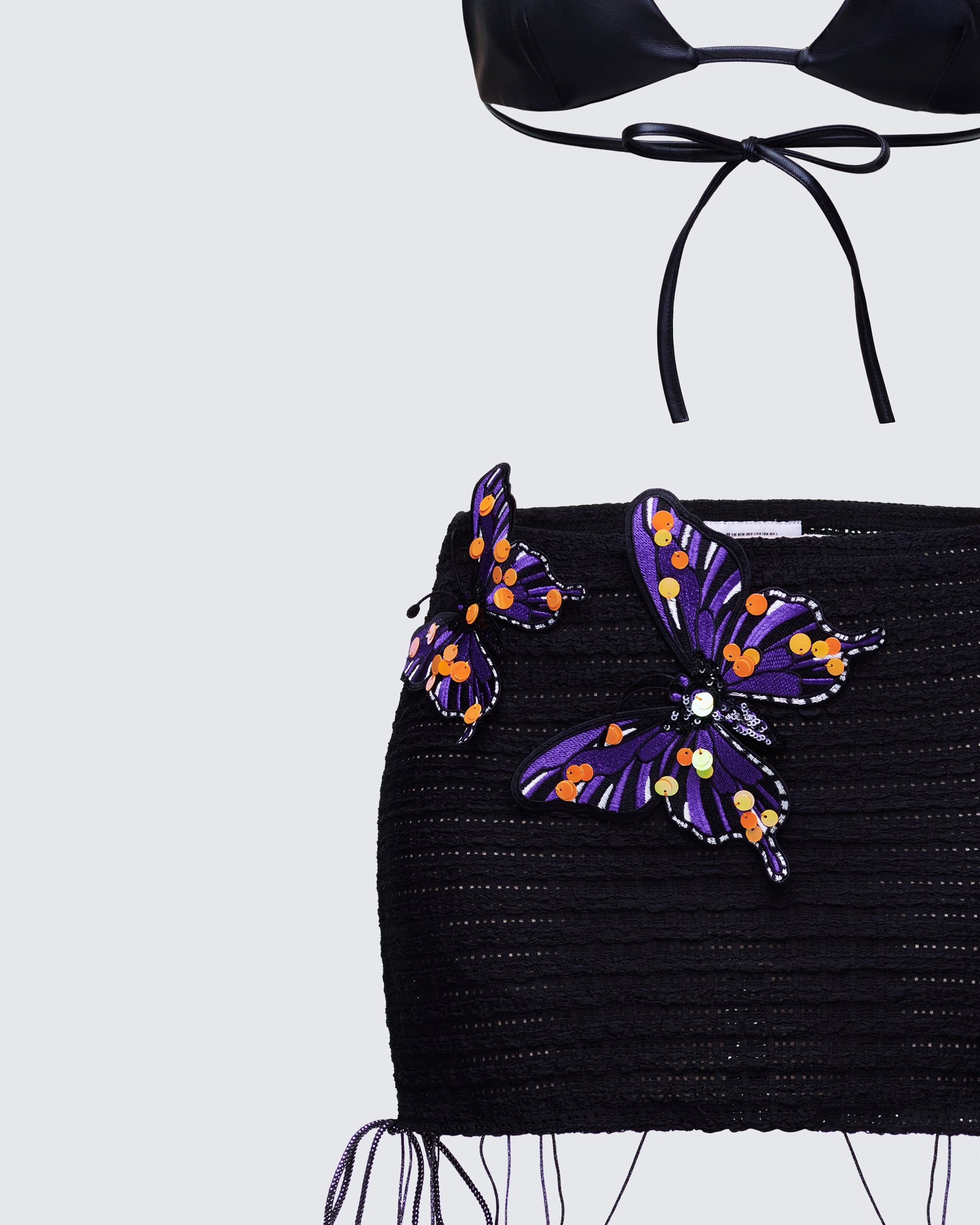 <p>Zaria Black Vegan Leather Bikini Top: Coating: 100% Polyurethane</p><p>Backing: 100% Polyester </p><p>Lining: 90% Polyamide, 10% Spandex</p><p>Saffy Multi Butterfly Applique Mini Skirt: 94% Polyester, 6% Spandex</p>