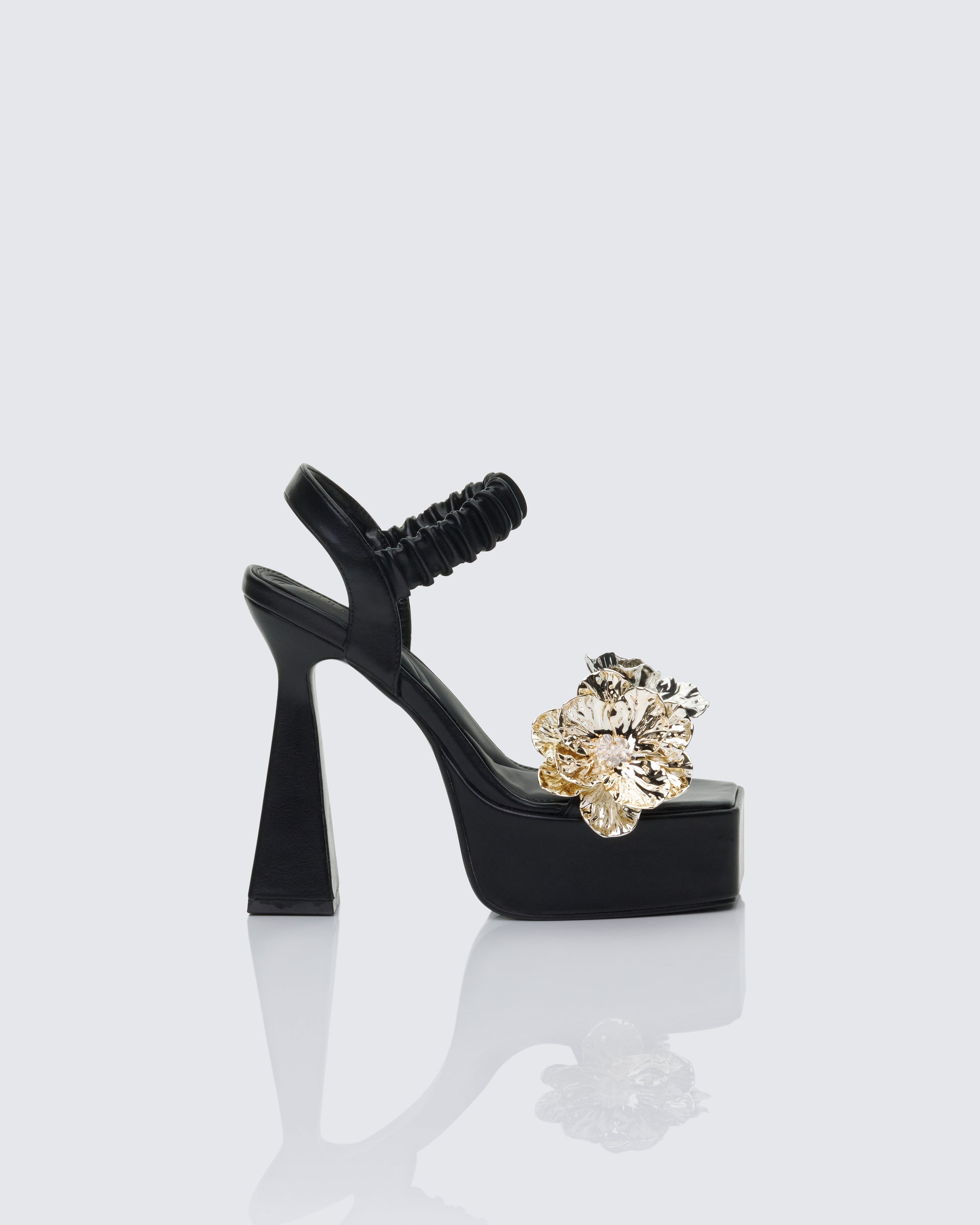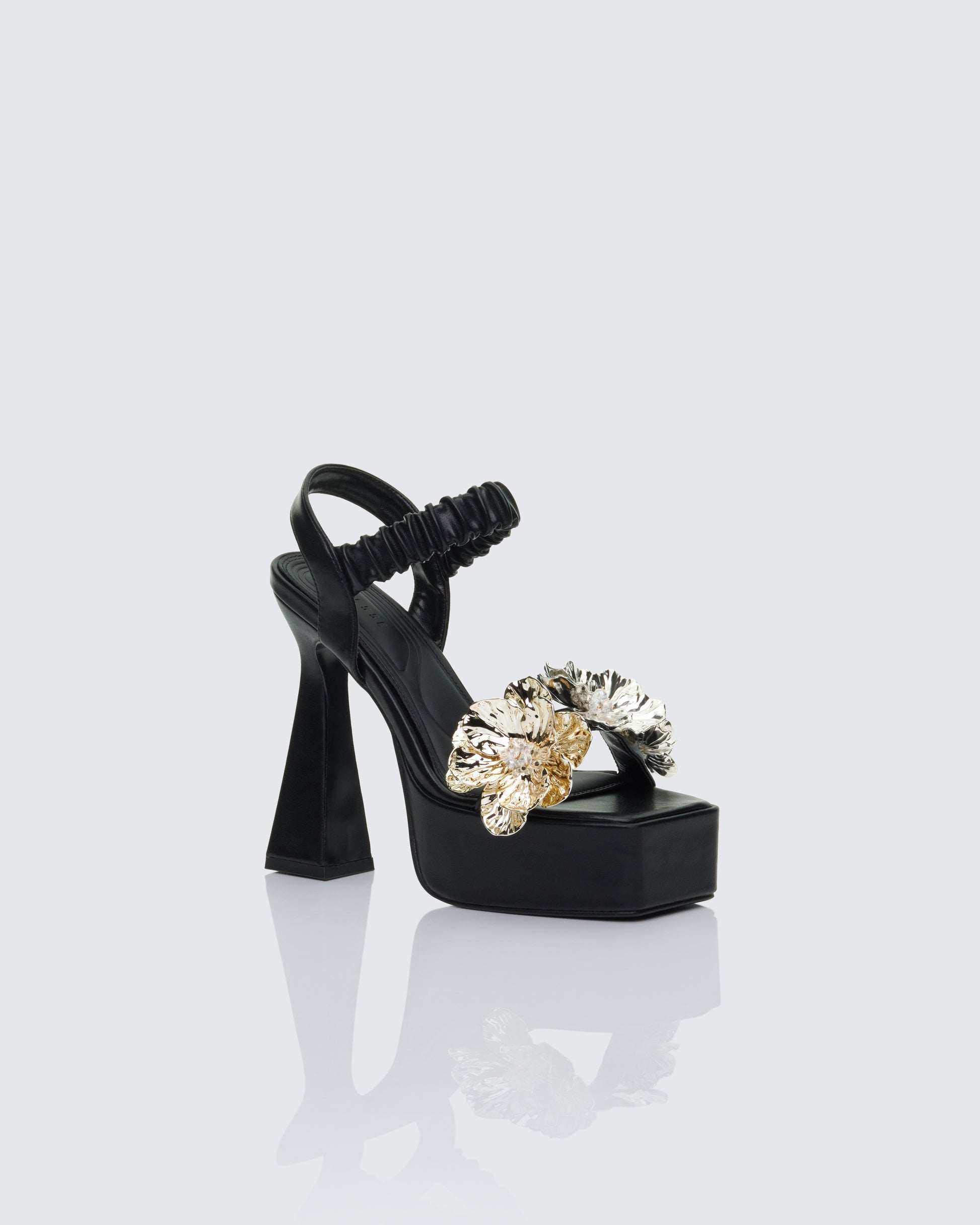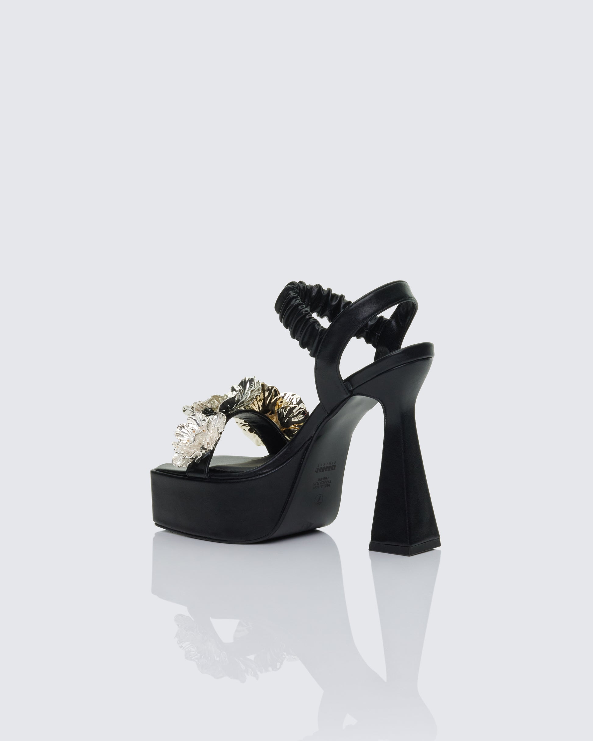 Drama from the ground up 🤭 With a bold platform, scrunchie ankle strap, and metallic flower detail - these aren't just a heel, they’re a headline 🖤
