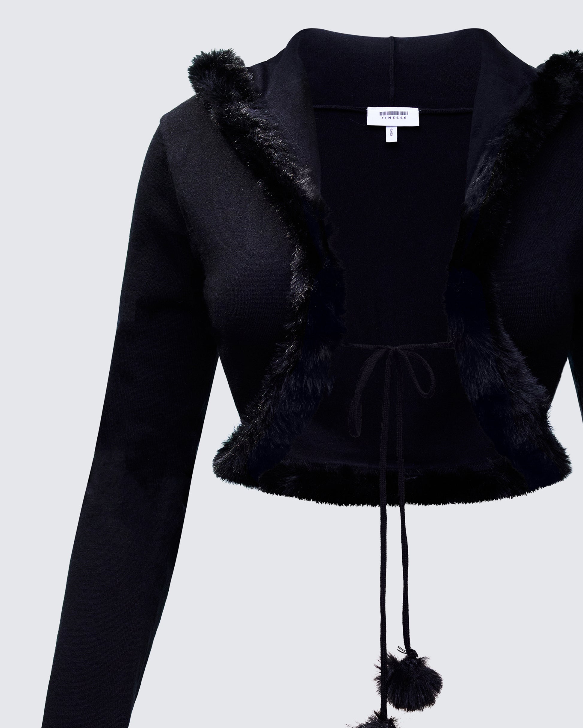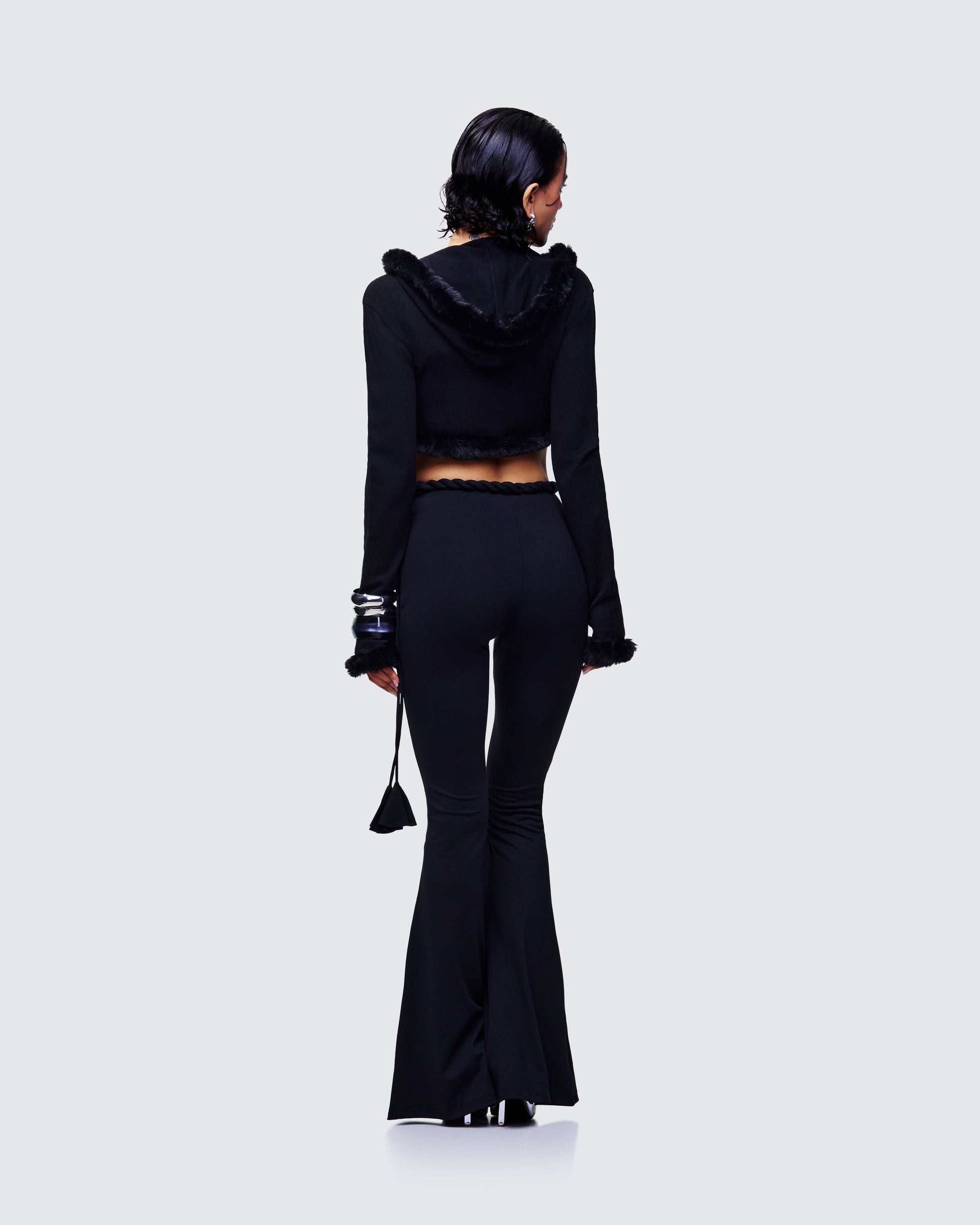 Too glam to give a fur π€ This cropped knit cardi with plush faux-fur trim and pom-pom ties, paired with soft black jersey kick-flares, serves cozy comfort with a cool-girl twist π₯