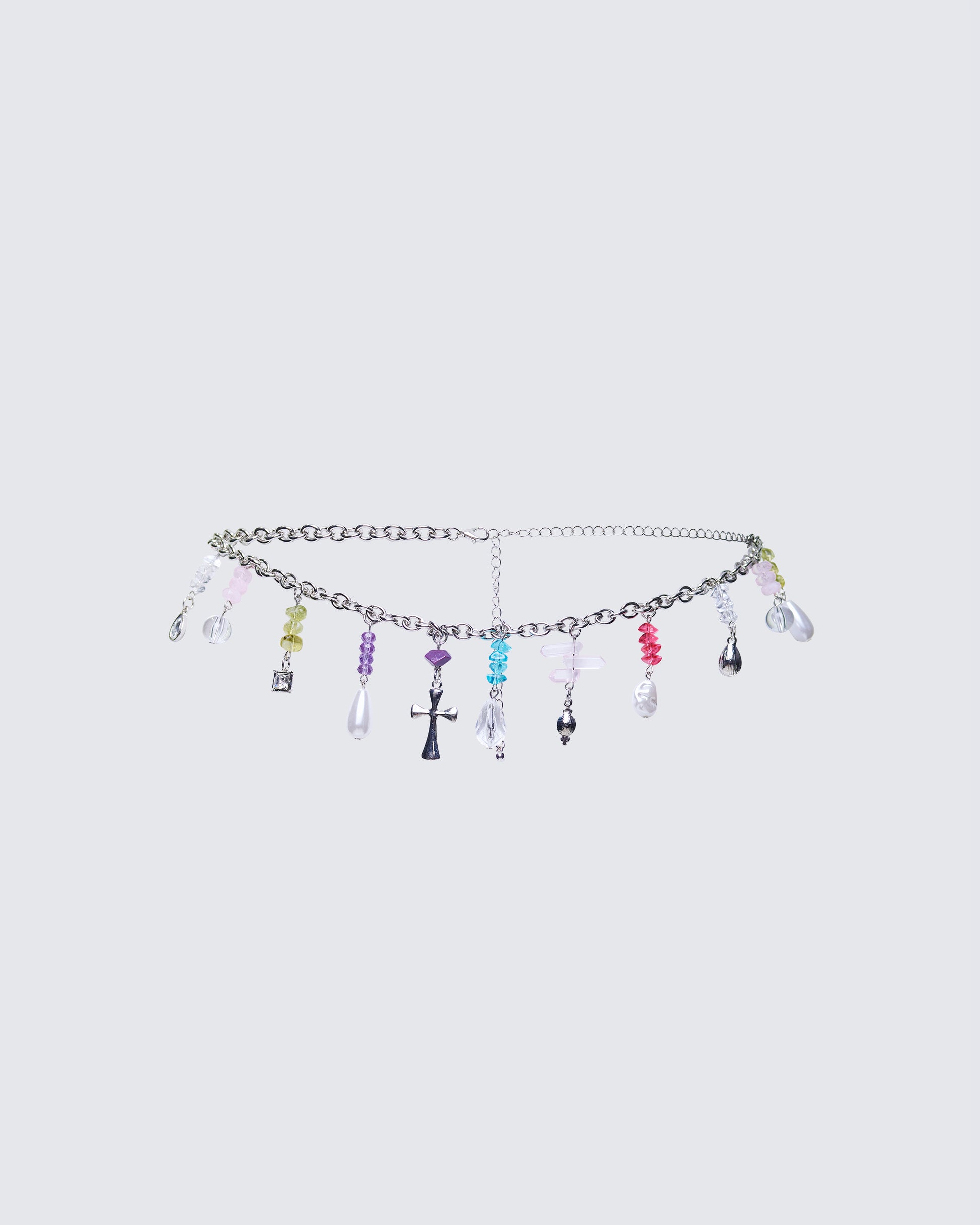 Built for the girls who don’t do minimal 🙌 This silver chain is stacked with faux pearls, gemstone drops, and a crucifix charm - the perfect clash of glam and grunge for your waistline 🖤