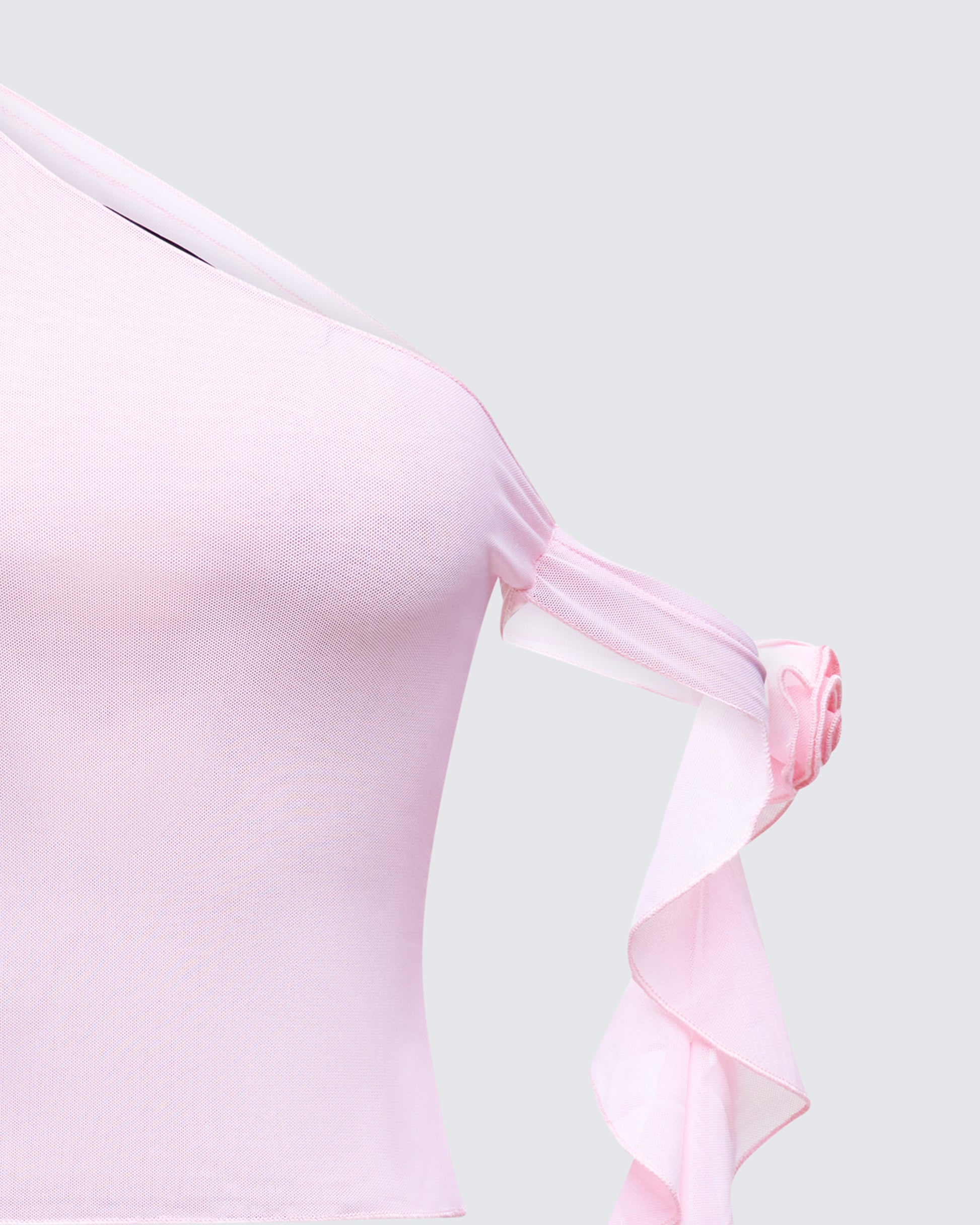 Perfect in pink 💞 Featuring sheer mesh fabric, finished with a single sleeve and tie detail, this asymmetric top is an ideal addition to every pink-girl's wardrobe ⭐️