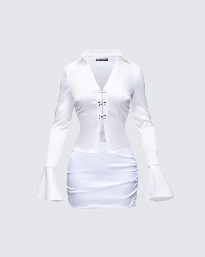 A set for every occasion π Combining a pink mesh asymmetric top with a white satin micro mini skirt, this set will take you from dinner to the club in an instant β¨
