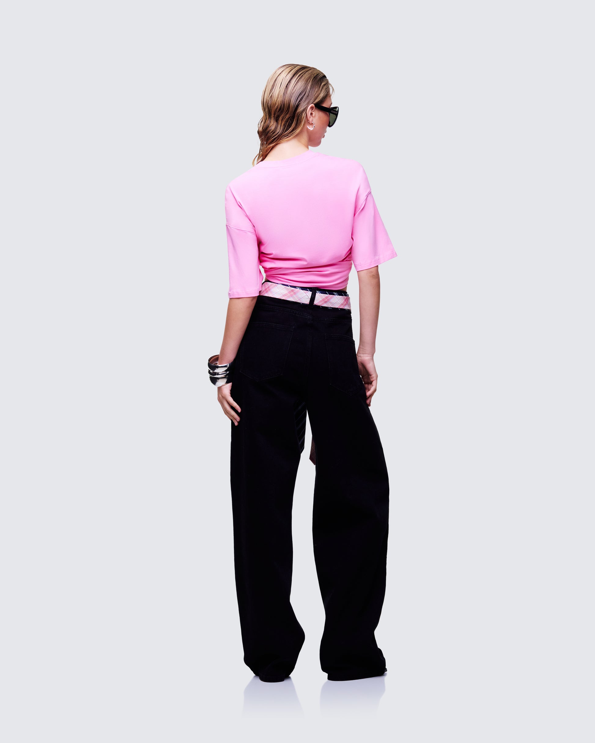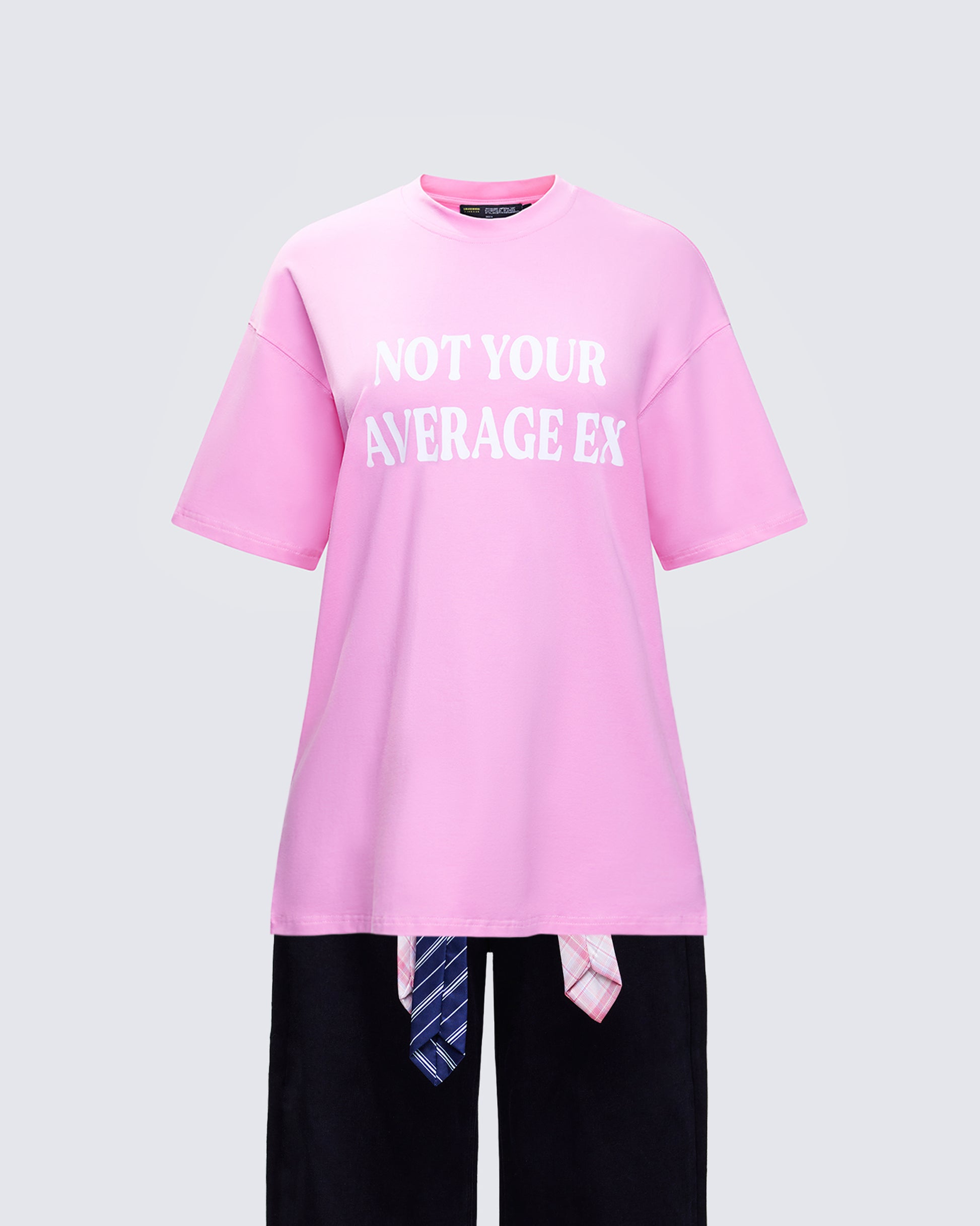 That oversized pink tee energy with "NOT YOUR AVERAGE EX" splashed across the chest like a warning label. Black denim wide-legs keep it grounded while that random tie detail swings from your waistband like you forgot to finish getting dressed.