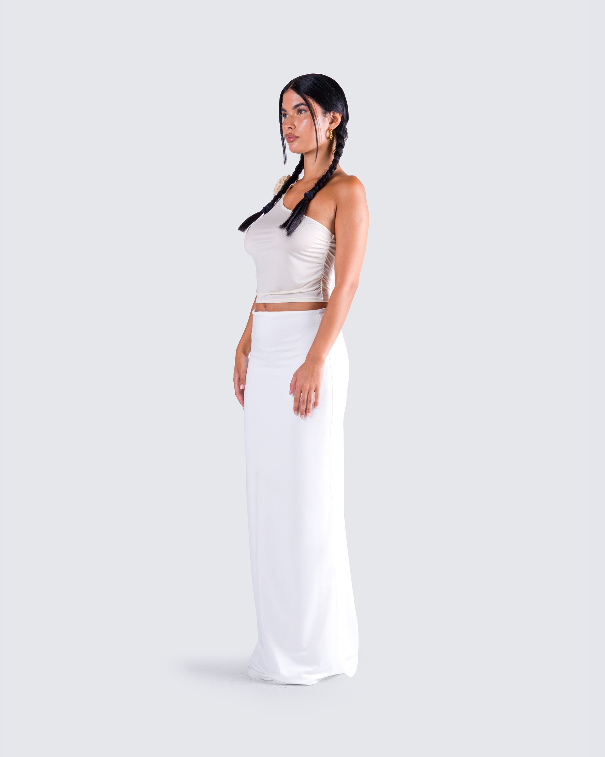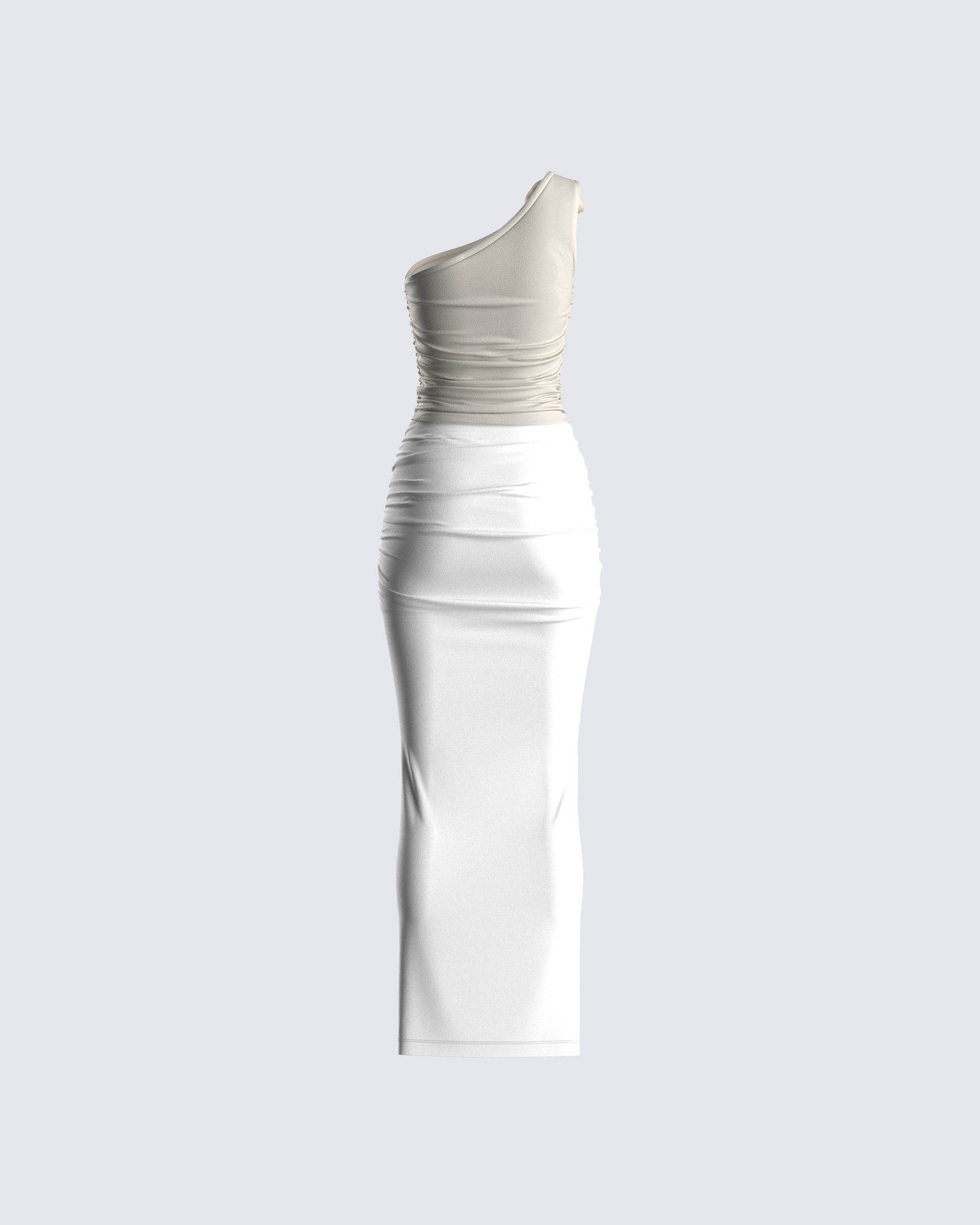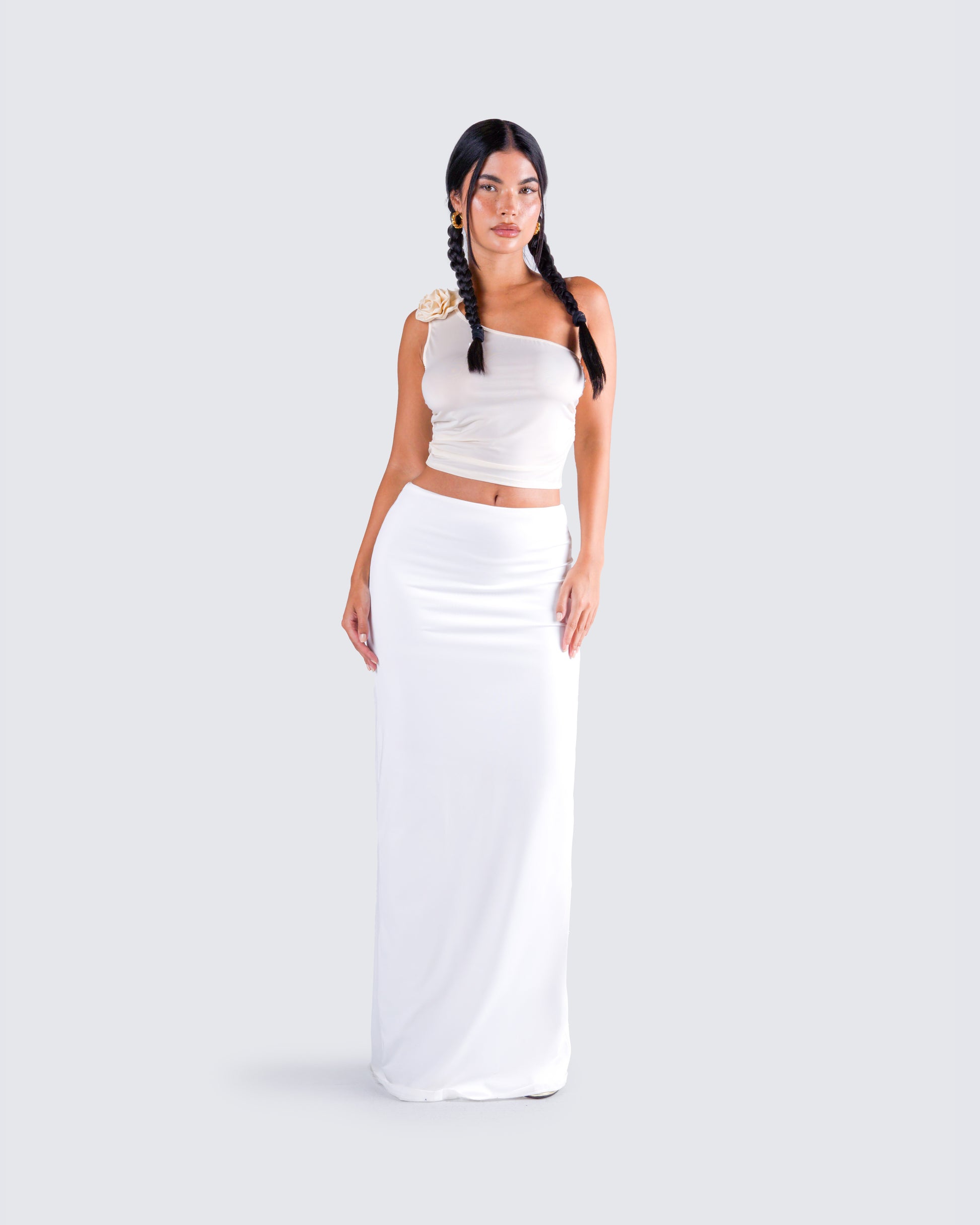 A clean, elegant, and classy look for you to own the night in š¤Ā Featuring an ivory one shoulder top, paired with a white jersey maxi skirt - this two-piece set is giving "expensive, and untouchable"Ā š
