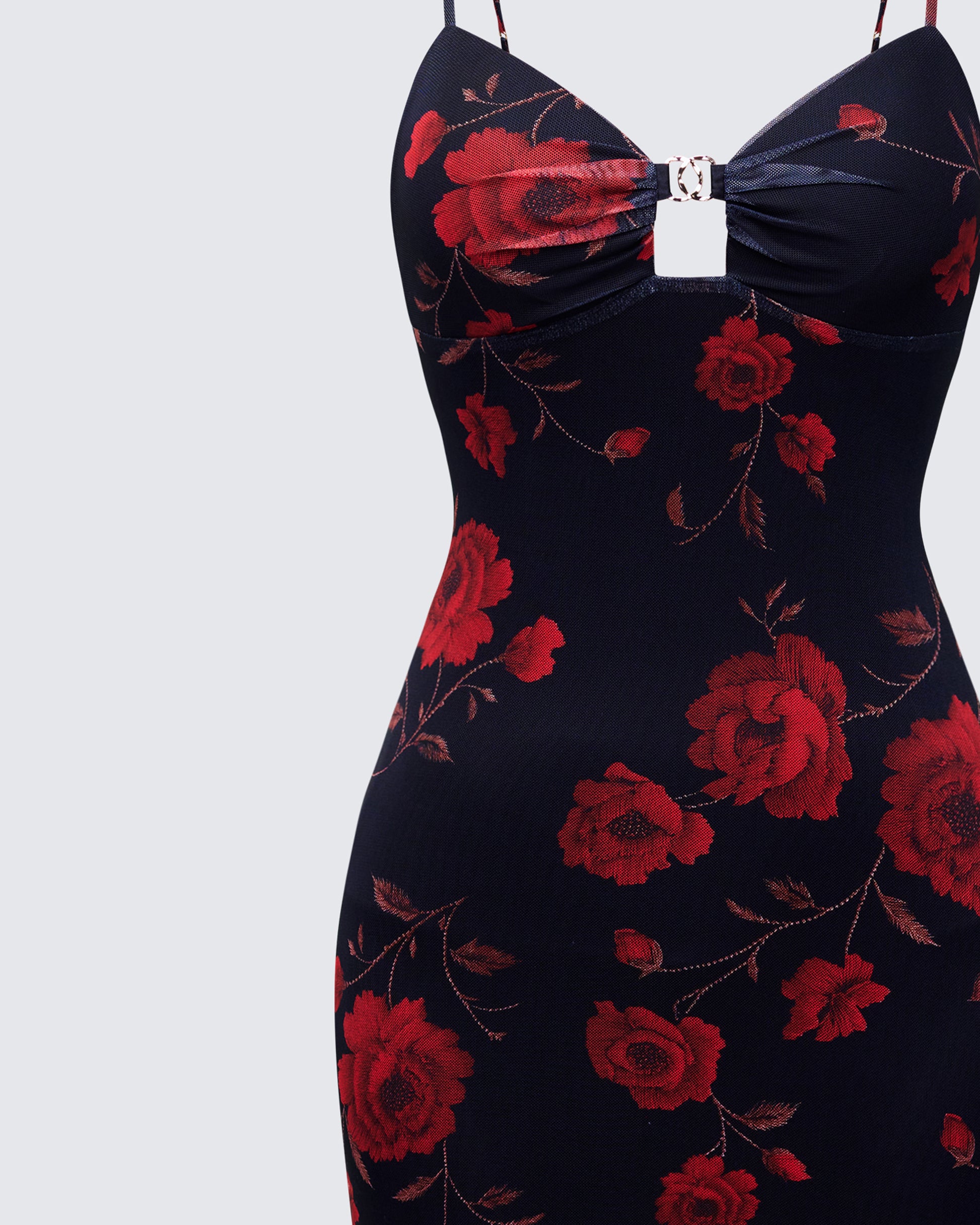 Dark romance done right 🥀 This mesh mini blends moody florals with a fitted silhouette, scalloped lace hem, and glint of gold hardware for a look that’ll leave them under your trance 🖤