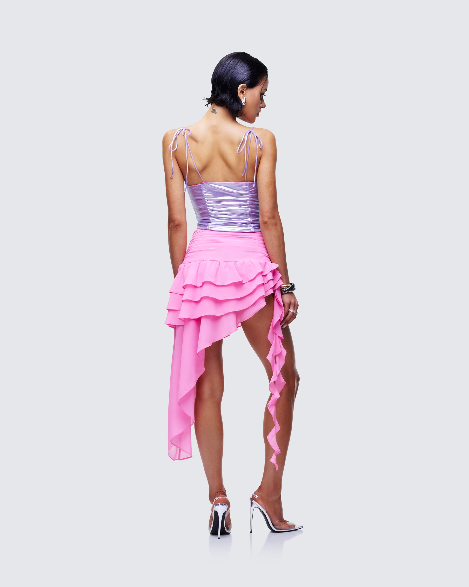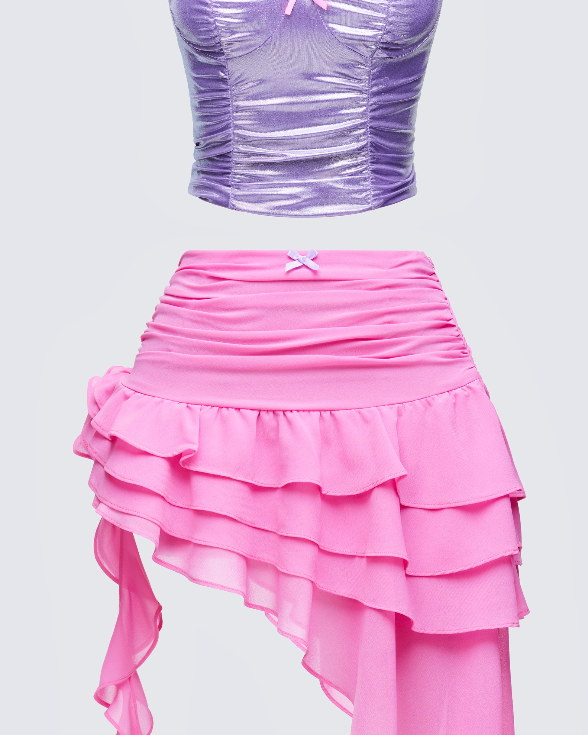 Double the trouble, double the stares π Pairing a metallic ruched cami top and a pink chiffon layered mini skirt - this glam meets girly in this two-piece set is made for everything from rooftop sunsets to messy dance floors π