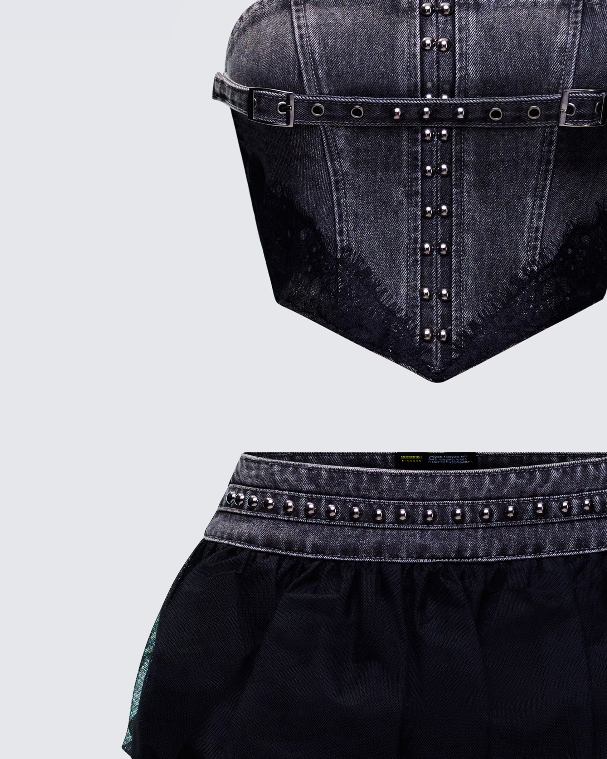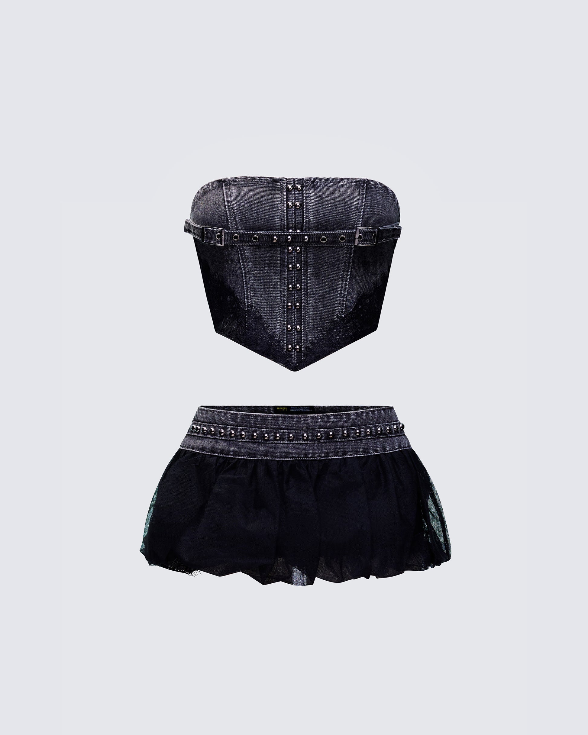 The prettiest kind of threat π€ Complete with a black denim corset top and a matching mini skirt, this two-piece set knows how to keep the hooked π