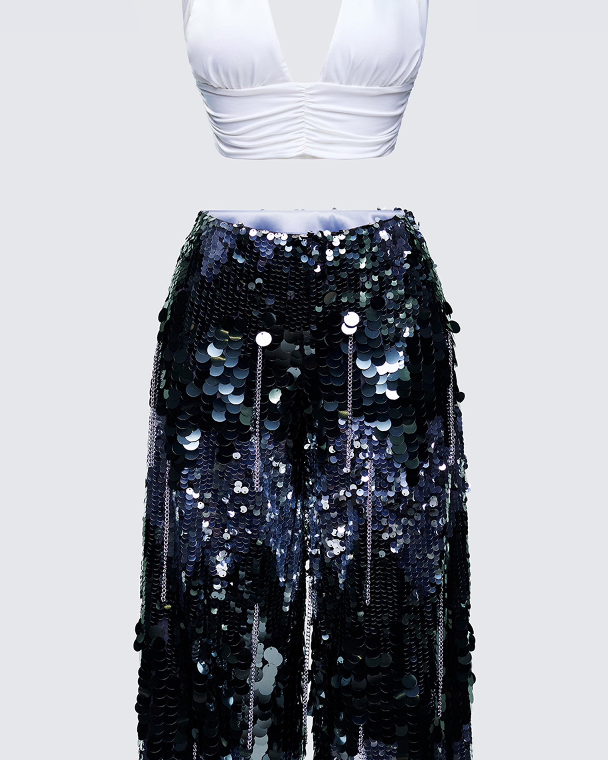 Consider this your good-girl-gone-glam moment ✨ Made for dance floors, dinner parties, and anyone who believes subtlety is overrated - this set features an ivory jersey halter top and a pair of silver sequin pants 🤩