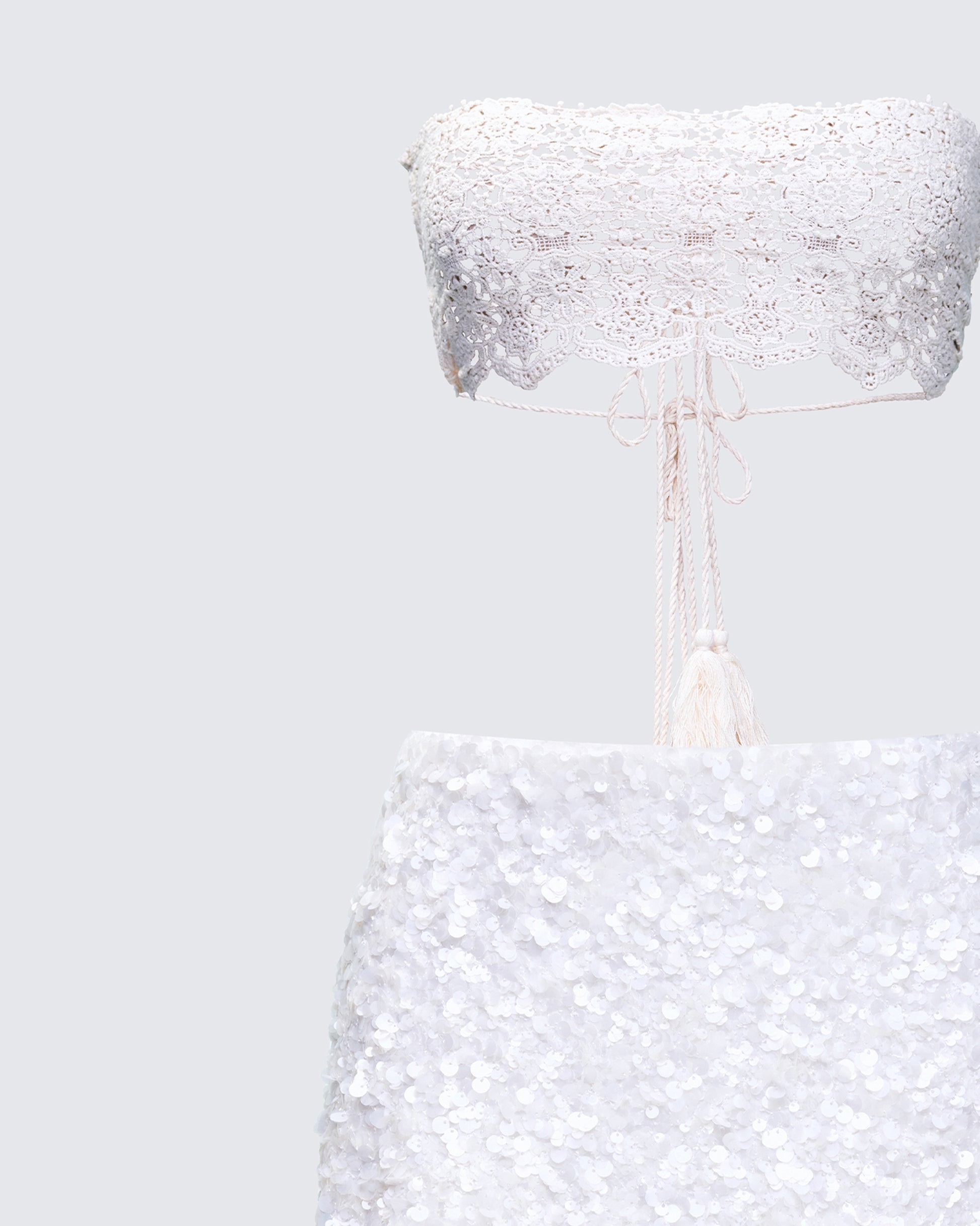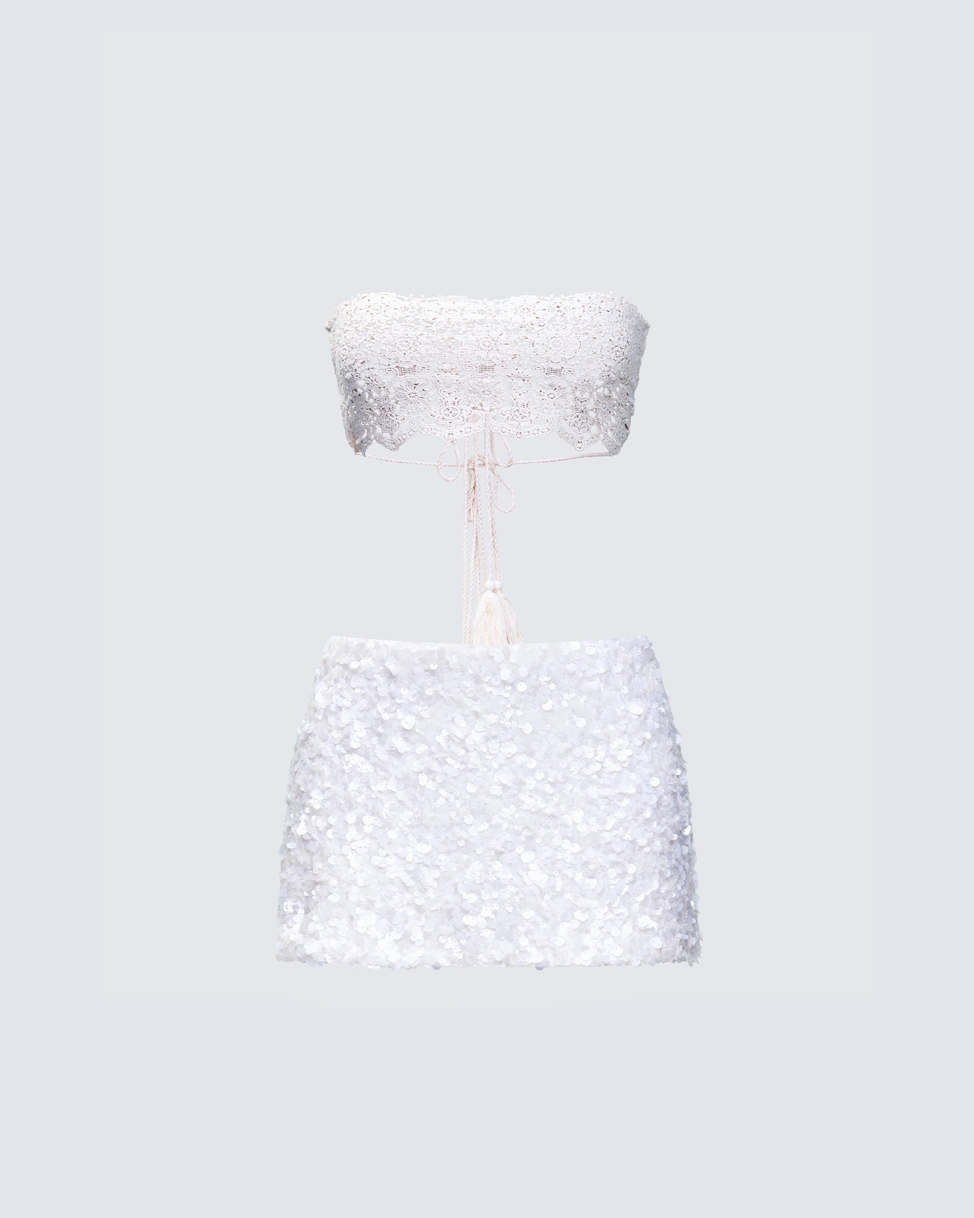 When boho goes bold 🤍 This two-piece set, pairing a white crochet bandeau top with a silver shell sequin mini skirt, is the kind of look that turns soft girl energy into a full-blown spectacle ✨