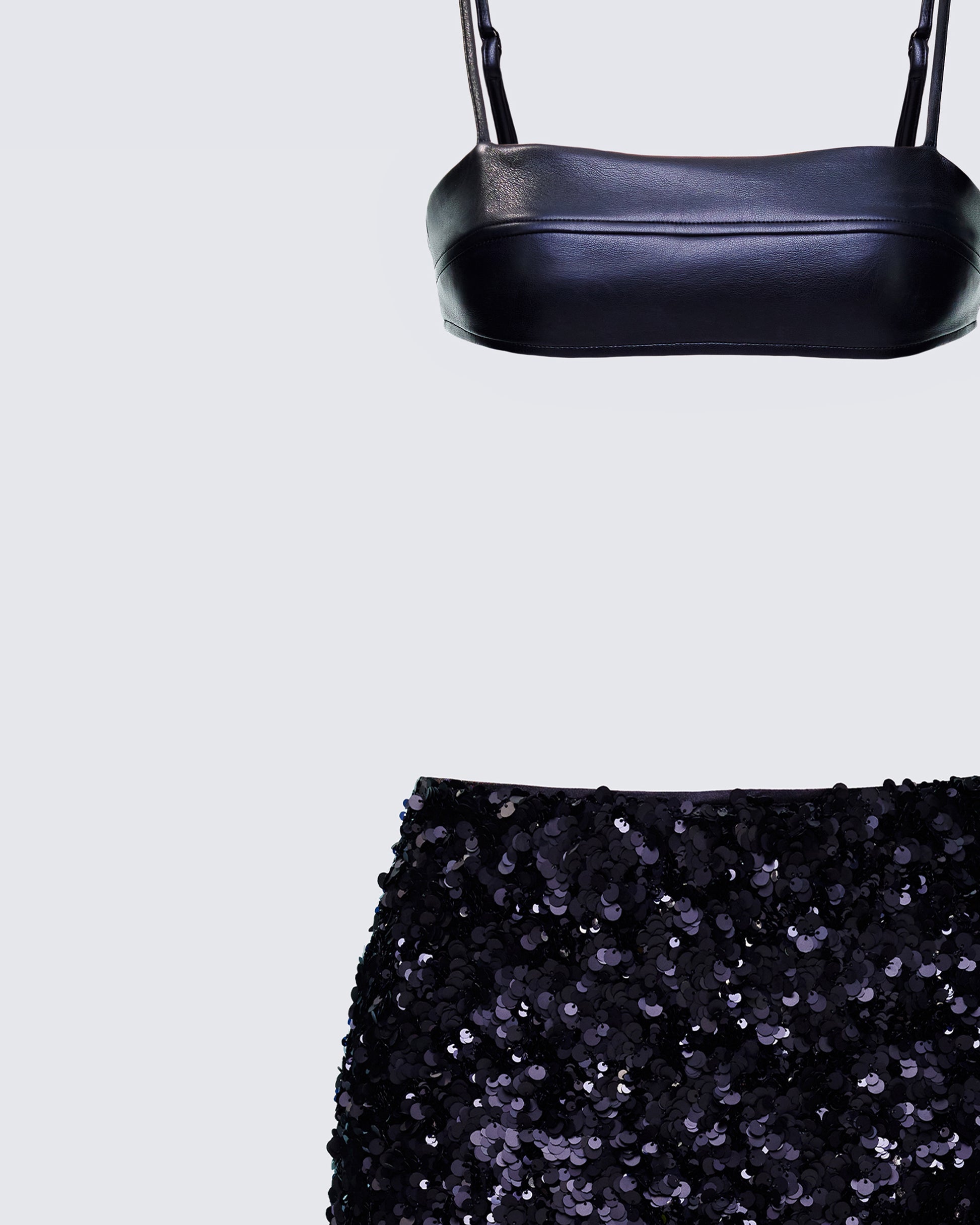 You won't have to wait in line in this fit π Serve a lil femme fatale on a dance floor in this two-piece set featuring a faux-leather bra top and a black shell sequin mini skirt π€