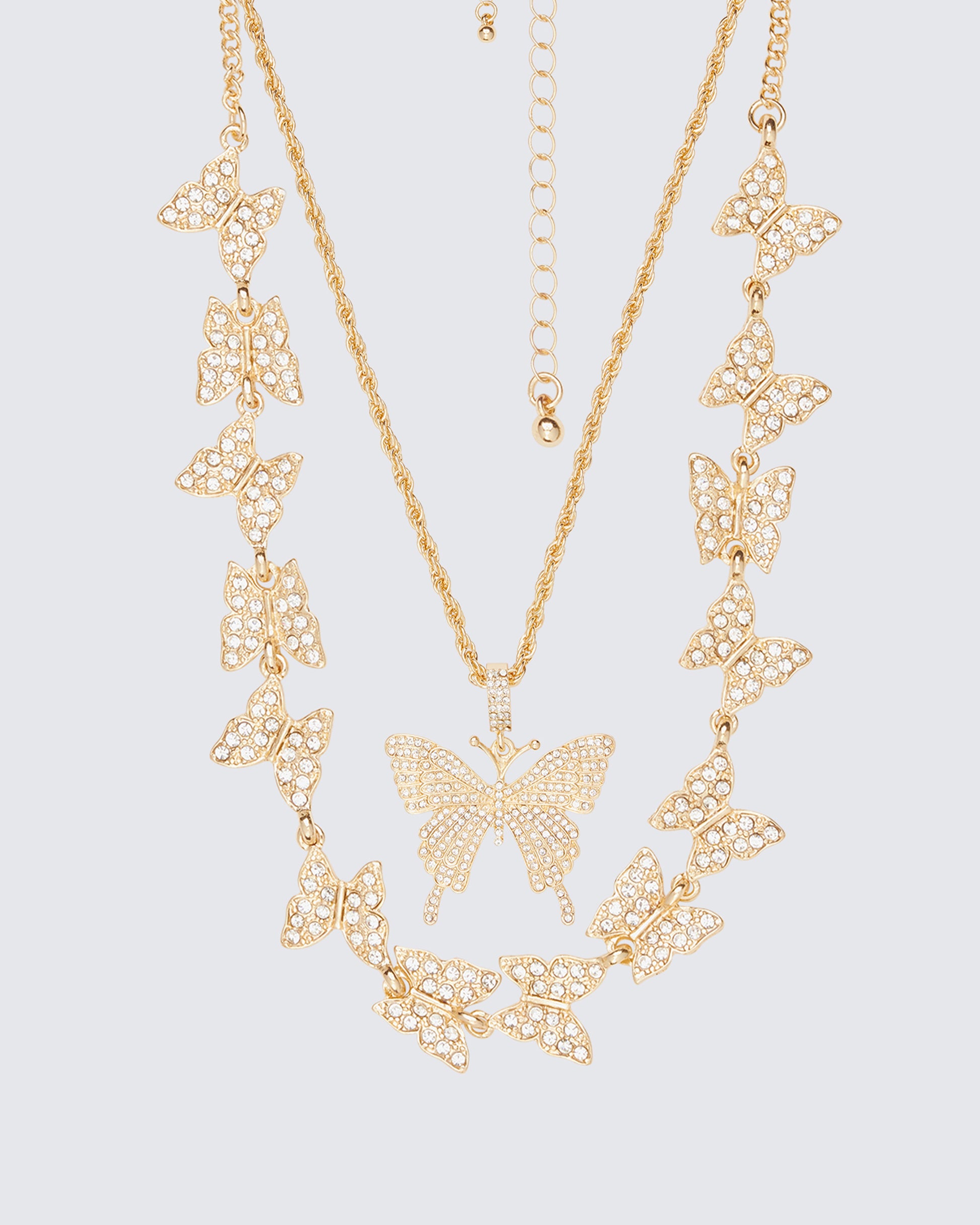Born to cause butterflies 🦋 This gold stack layers pavé crystal wings with a bold pendant moment — soft wings, strong energy 💕