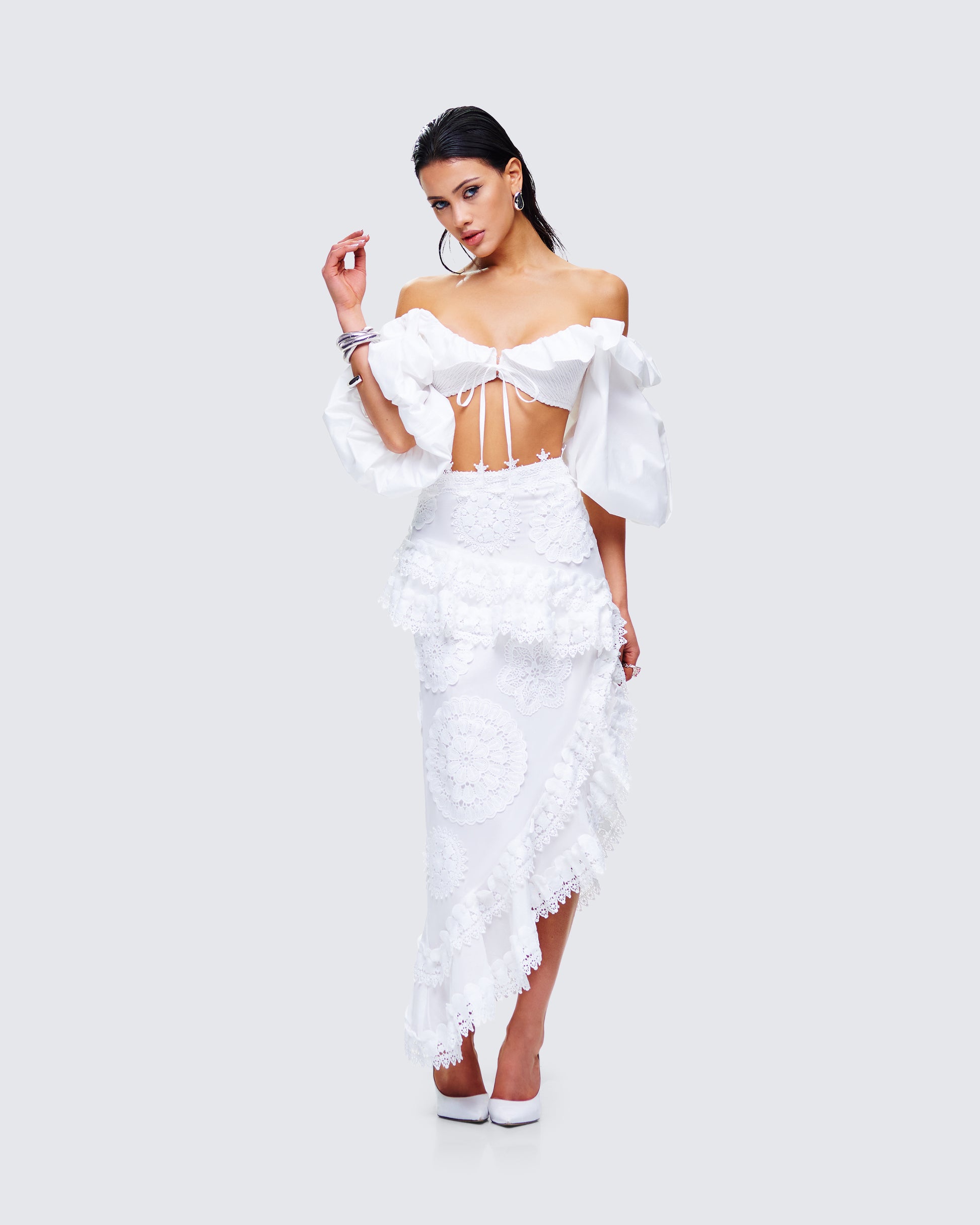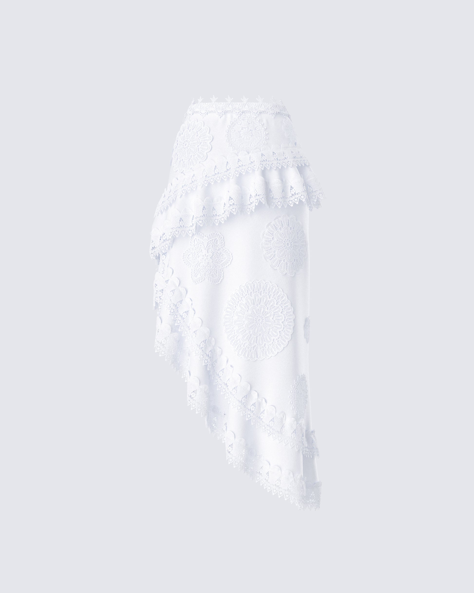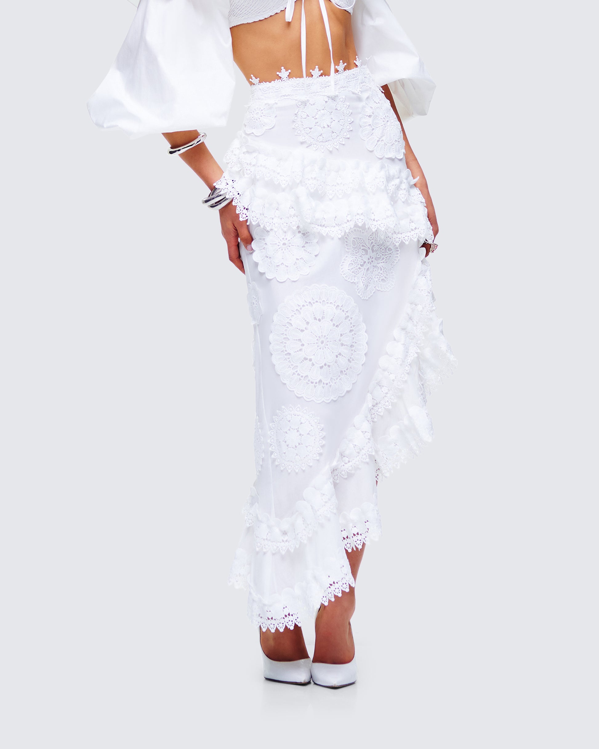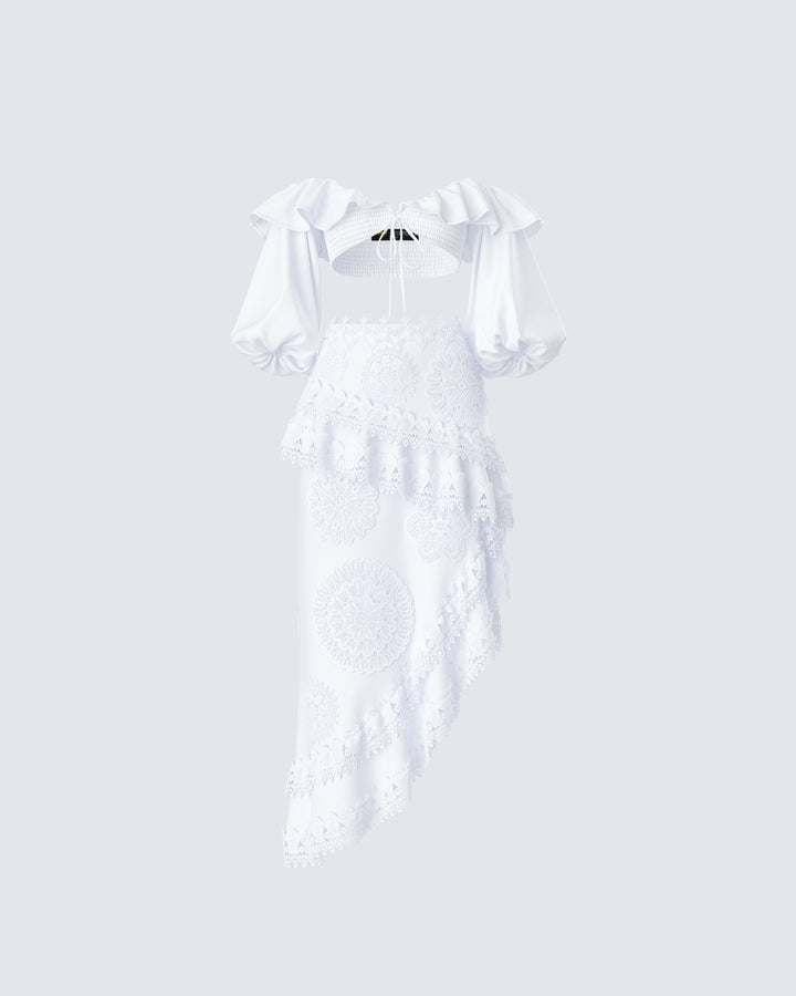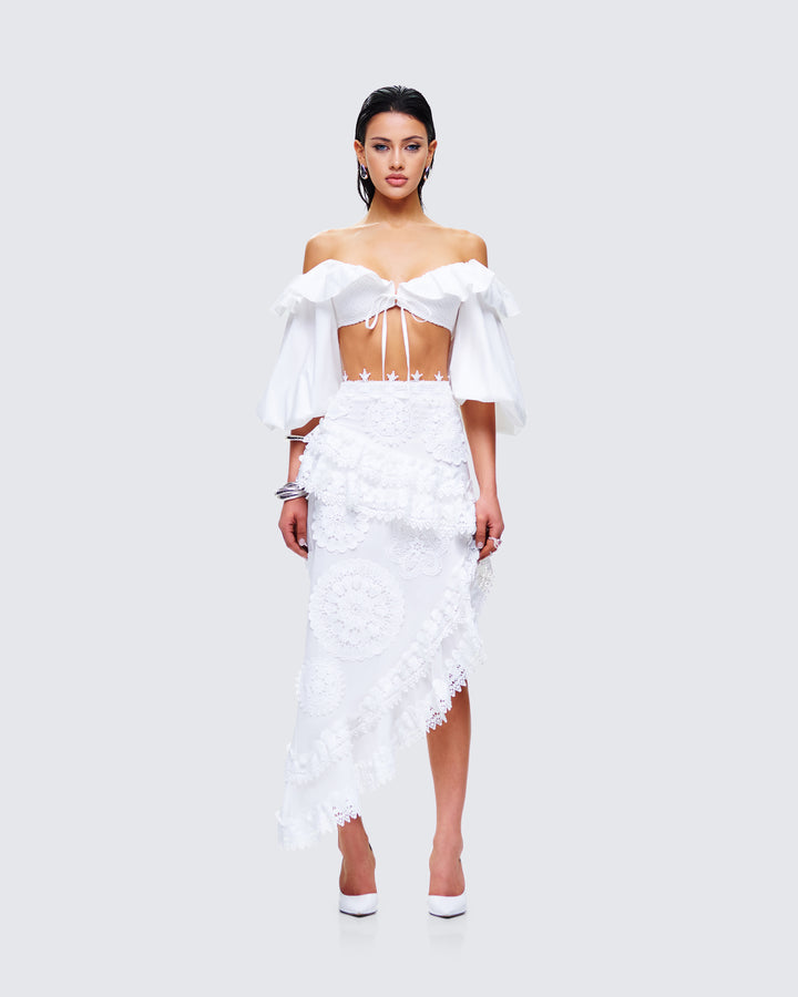 Twirl your way into their hearts in this white asymmetrical skirt 😊 Made from poplin fabric and featuring embroidered applique, ruffles, and lace trim - this piece will leave everyone speechless over your aura 🤍