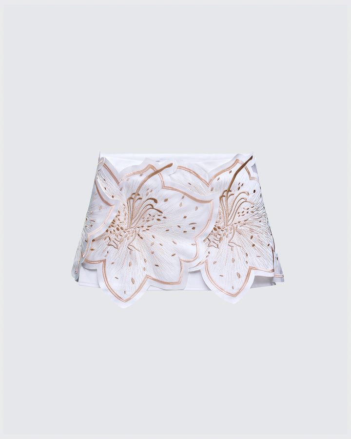 <p>Aurelia White Long Sleeve Mesh Top: 95% Polyester, 5% Spandex</p><p>Ylva White Applique Mini Skirt: 85% Polyester, 15% Rayon</p>