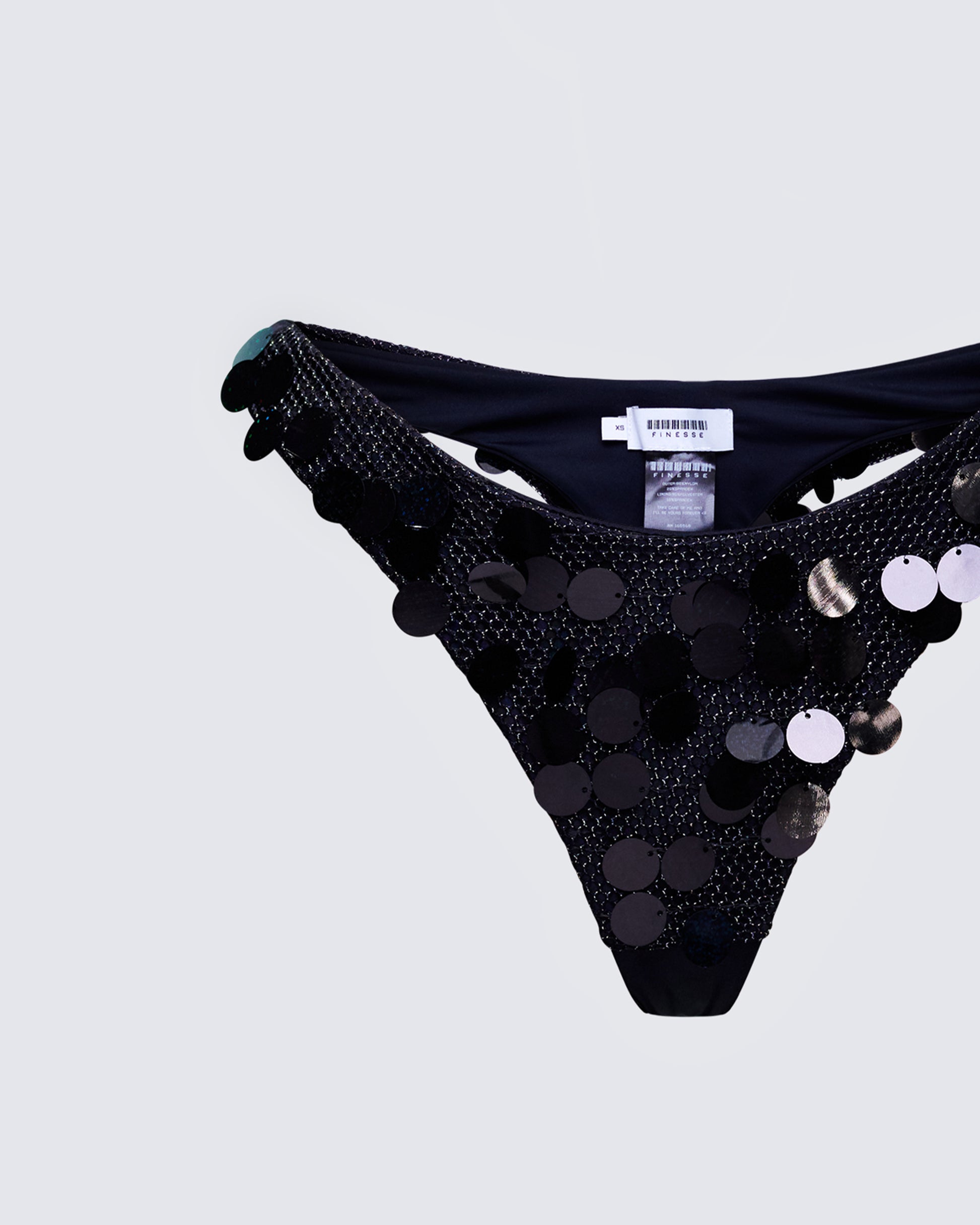 Why keep it modest when you can make it memorable? 😜 Sequins cover every inch of these cheeky thong bottoms, made for tanning, turning heads, and starting trouble 🖤